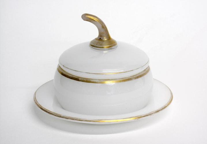 börmum og á haldi. Kúpan stendur á undirskál (17 cm í þvm.) með gylltri