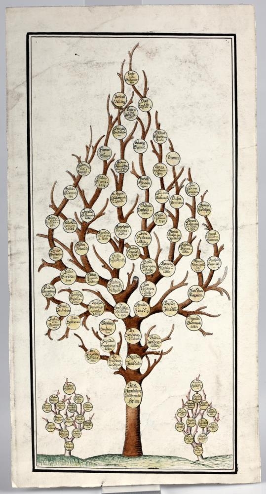 Nr. 96, a-c: Ættartrje Gunnlögs sýslumanns Briems á Grund, dregið upp af honum sjálfum á blað, st. 17,5 x 37 cm, og tvær eptirmyndir af því eptir Samuel kennara Eggertsson í Rvík, önnur mjög stækkuð og í gylltri umgjörð með gleri, st. 61 x 84 cm.