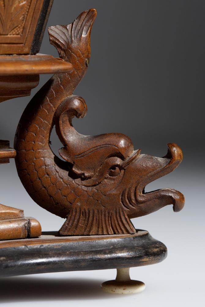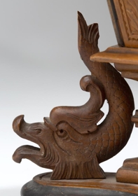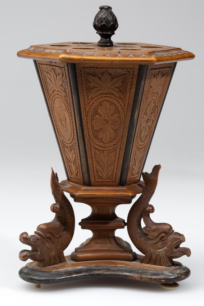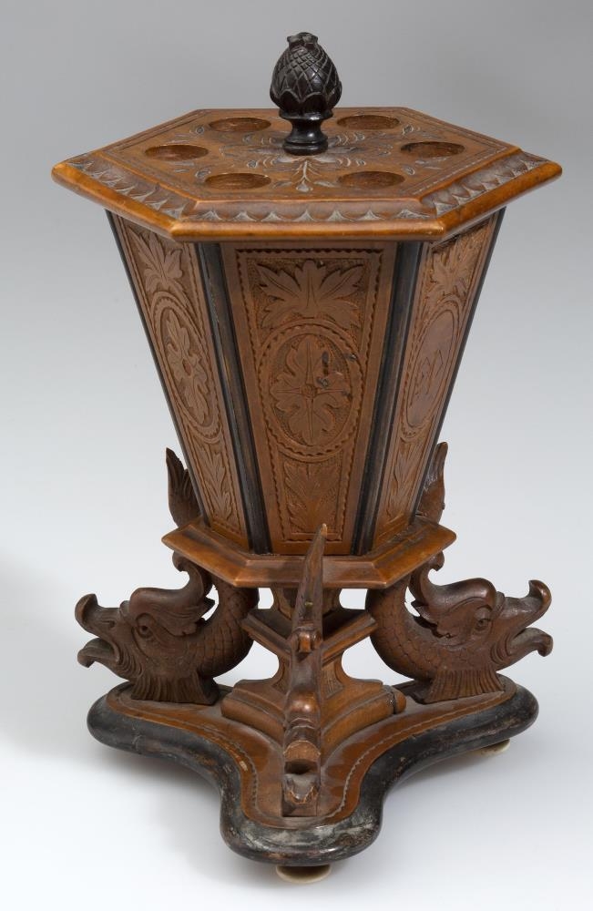 Vindlastæði, útskorið, smíðað úr ljósbrúnum harðviði. Hæð þess um 20,4 cm, þvermál 13 cm. Er gripur þessi felldur saman og límdur en auk þess festur saman með skrúfum og nöglum úr kopar. Aðalhlutinn er niðurmjótt, sexhliða hylki, og eru höfð speldi, allþykk, í hliðum, en plata felld að við endana, er þykkt efri plötu 1 cm, hinnar neðri 0,6 cm, við efri plötuna er mest þvermál á hlutnum. Sex göt, kringlótt, fyrir vindla, eru gerð í efri hylkisendann, gegnt hornunum, vídd þeirra 1,7 cm, og á miðjum endanum haft typpi, um 3 cm á hæð, með aldinlögun. Hylkið hvílir á stoð, er það þrístrendur stautur, um 5 cm á hæð, með útstæðum brúnum bæði að ofan, í miðju og að neðan, undir stoðinni er plata, þríarma, 12,5 cm að þvermáli, þykkt um 1 cm, með bogadregnum brúnum. Settir eru undir plötu þessa litlir, kringlóttir fætur úr beini, felldir í utarlega á örmum, hæð þeirra mest 1 cm. Stoðarhorn standast á við miðjar hliðar hylkis en að neðan við arma plötunnar. Allófrýnilegur kynjafiskur rís á armi hverjum, hæð rúmlega 7 cm mest, er höfuð látið vita fram en sporðurinn nær upp fyrir botnplötu hylkis. Við mót hliðanna eru ávalar rastir en úrtök á hinum láréttu brúnum á hylkinu og á stoð og plötu. Fínlegt jurtaskraut í hylki að utan, grunnskorið, þar sem gerðir eru bekkir og rammar, en grunnur víða hrjúfur, skorið er fangamark, OF, með skrautlegum upphafsstöfum, og andspænis því ártal, 1910. Lakkaðir og hrufóttir fletir í útskurði stoðarinnar en með brúnum plötunnar er gróp. Typpið, rastirnar og brúnir á plötu þessari með svartri lakkhúð, annars staðar er borin á olía. Brotnað hefur af, lakkhúðin eydd.