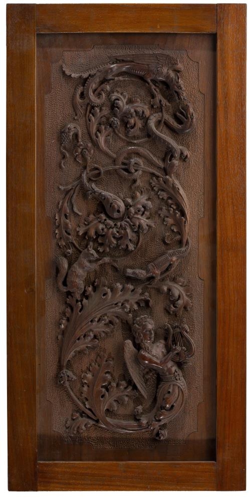 úr hnotviði, 24 x 55 cm að stærð, með hátt upphleyptum útskurði í endurburðarstíl,
