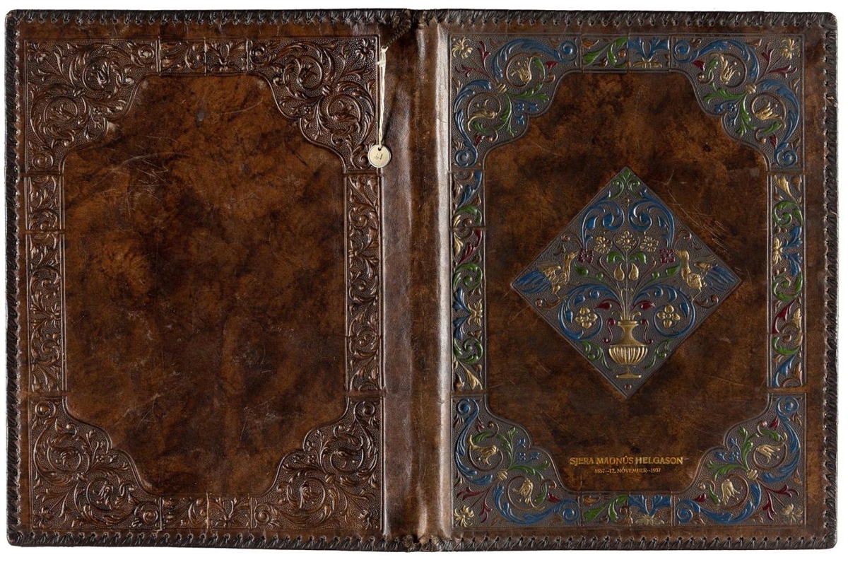 Skrautmappa, bundin í dökkbrúnt skýjað skinn, með miklu áþrykktu skrauti. Allt í kring á framhliðinni er bekkur með blómskrauti, gylltu, bláu, grænu og rauðu, við hvert horn markar hann eins og sérstakan, breiðari reit með tveimur bogalínum inn eftir. Á miðju er tígulmyndaður reitur, er neðst á honum blómakrukka gyllt og út frá henni kvíslast blöð og blóm, en tveir syngjandi fuglar með hálflyftum vængjum sinn hvoru megin. Að utan eru randirnar bryddar með þunnri skinnræmu, sem þrædd er gegnum göt innan við röndina. Neðst á framhlið, rétt ofan við rósabekkinn er letrað með latínuletri, gylltu: "Sjera Magnús Helgason / 1857 - 12. nóvember - 1937."