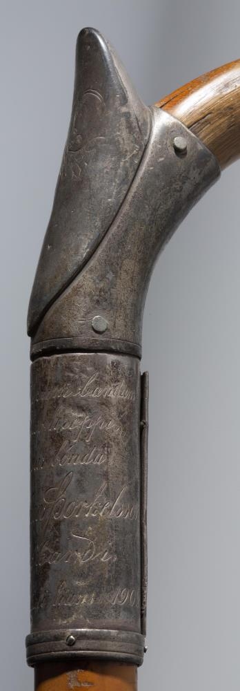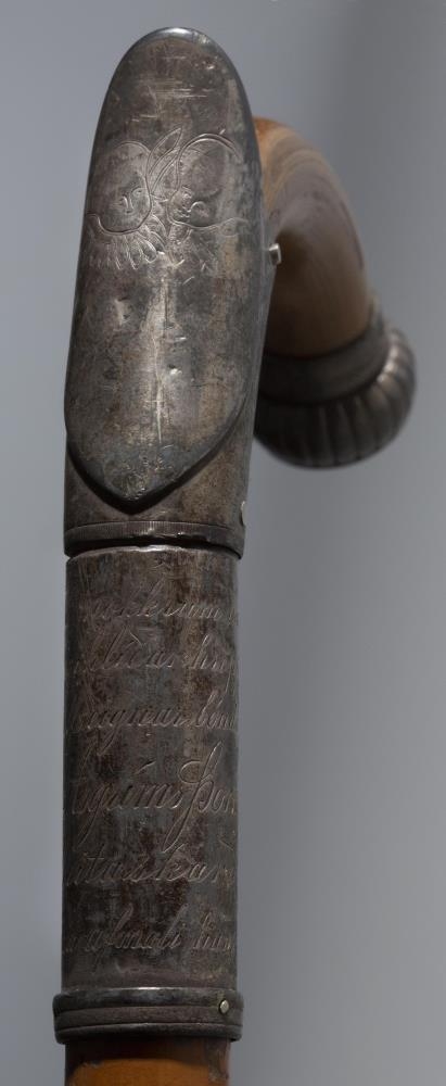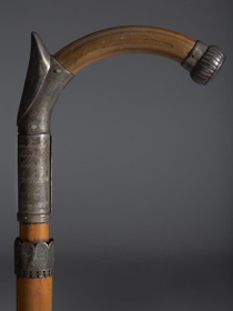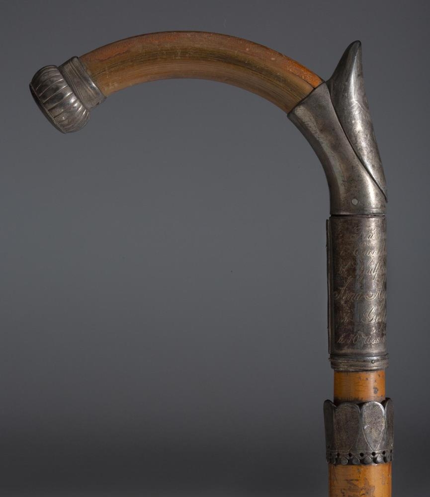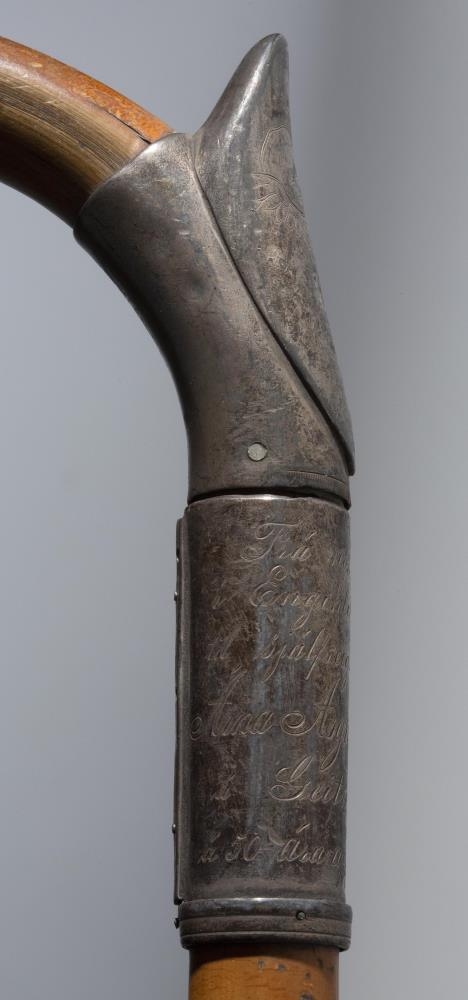 Göngustafur úr spanskreyr, silfurbúinn. Handfangið er króklagað, fremst á króknum er silfurhólkur með útflúruðum hnapp og fangamarkinu: ÁÁÞ. Í bugnum við stöngina er annar hólkur, um 5 cm að breidd; gengur hann upp í burst að framan og eru þar grafin á 2 englahöfuð, tekur þá við þriðji hólkurinn, 5,5 cm að breidd, með lítilli bryggju að neðan og samskeytum að aftan; á hann er grafið: "Frá nokkrum bændum / í Engihlíðarhreppi / til sjálfseignarbónda / Árna Ásgríms Þorkelssonar / á Geitaskarði / á 50 ára afmæli hans 1902."