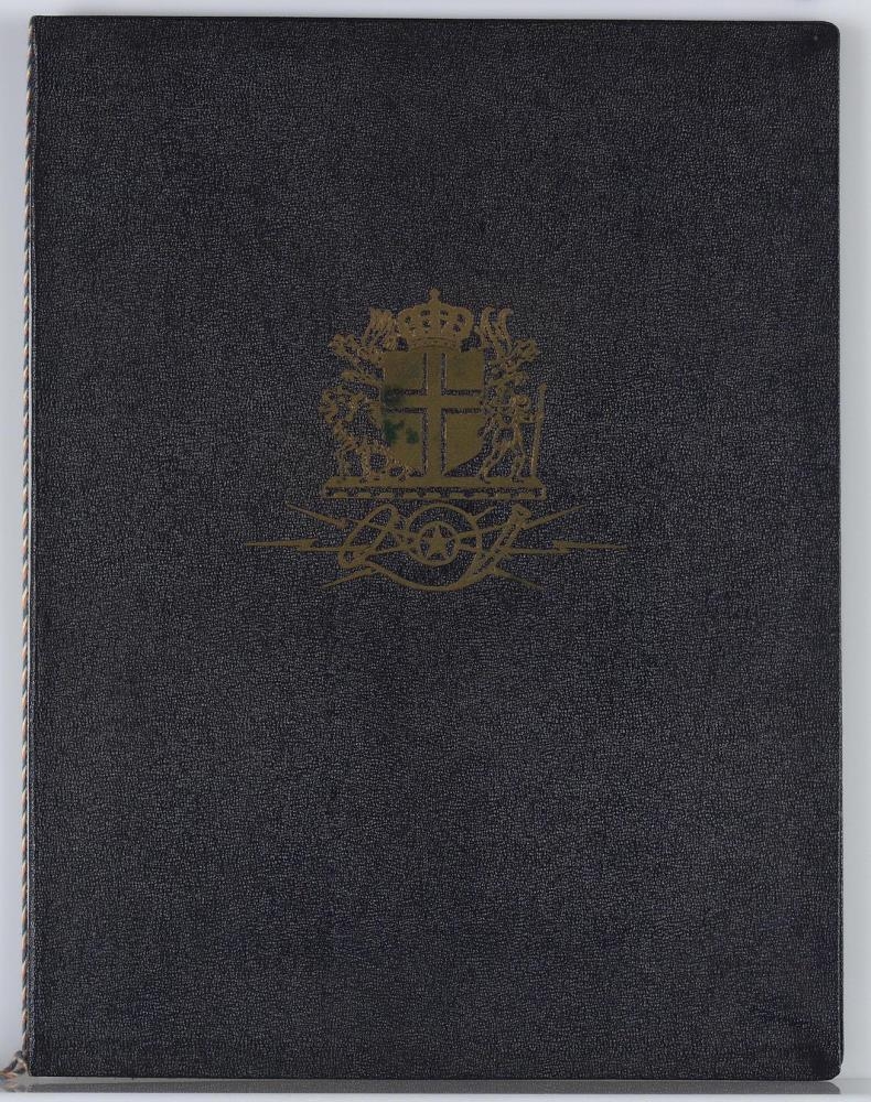 Mappa, bundin í blátt rexín, með merki landsímans á framhlið, í kjölinn er fest snúra með fánalitunum og lykkju og skúf þar sem endunum er fest saman; 29,7 x 22,7 cm að stærð. Inniheldur heillaóskaskeyti frá nemendasambandi Flensborgarskólans til gefandans á sextugsafmæli hans.
