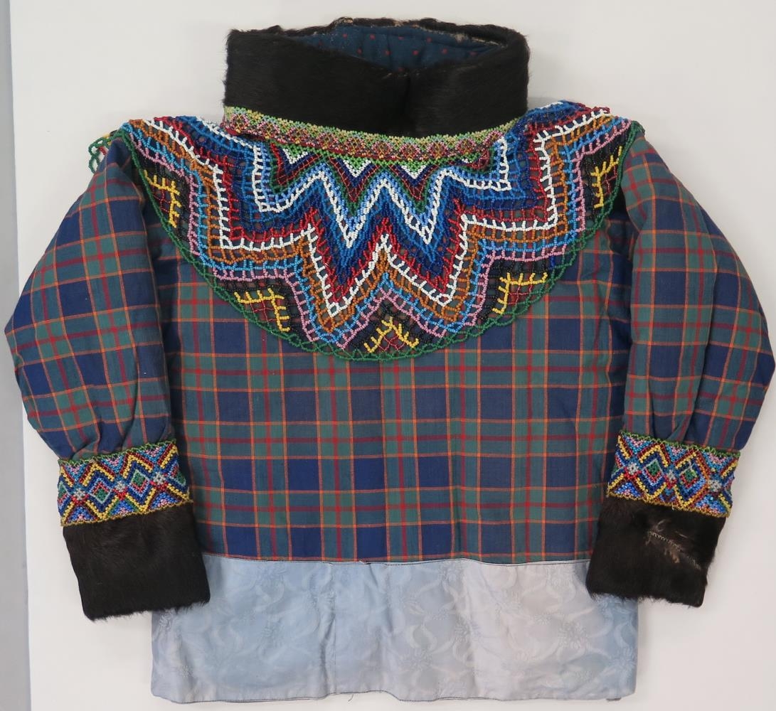 a) Stakkurinn, ysta borðið er úr blá og grænköflóttu lérefti. („tvisttaui“) með 13,5 cm. breiðu ljósbláu og rósofnu belti neðst. Innanundir er grátt léreft („shirting“) undir beltinu, og sömuleiðis er grátt léreft í yfirborði á einskonar undirstakki eða fóðri, og innst er blátt rauðdropótt léreft („sirs“), en milli laga mun vera æðarskinn með dún á. Kraginn um hálsinn er 7 cm. hár og klæddur dökkbrúnu nautsskinni, órökuðu, neðst, á honum er 2.cm. breiður perlukragi, og niður frá honum, yfir herðar, brjóst og bak, fellur 19 cm.breiður skrautkragi, einnig úr margvíslega litum glerperlum. Þessir skrautkragar kvað ætíð vera hver með sinni gerð, lýsa smekkvísi og hagleik þeirra, sem gera þá. Fremst á ermum er samskonar skinn og í hálskraganum, 9 cm. breitt, og uppfrá því eru 5,5 cm. breiðir borðar úr perlum um ermina. Stakkurinn er allur jafnvíður, 46 cm. að breidd samanlagður, um herðar litlu meiri, 50 cm.að lengd, 5 cm. að meðtöldu bláa beltinu. Kraginn er 57 cm. að innanmáli. Ermar eru 39 cm. að lengd, 12 cm. fremst 18 efst, lagðar saman.