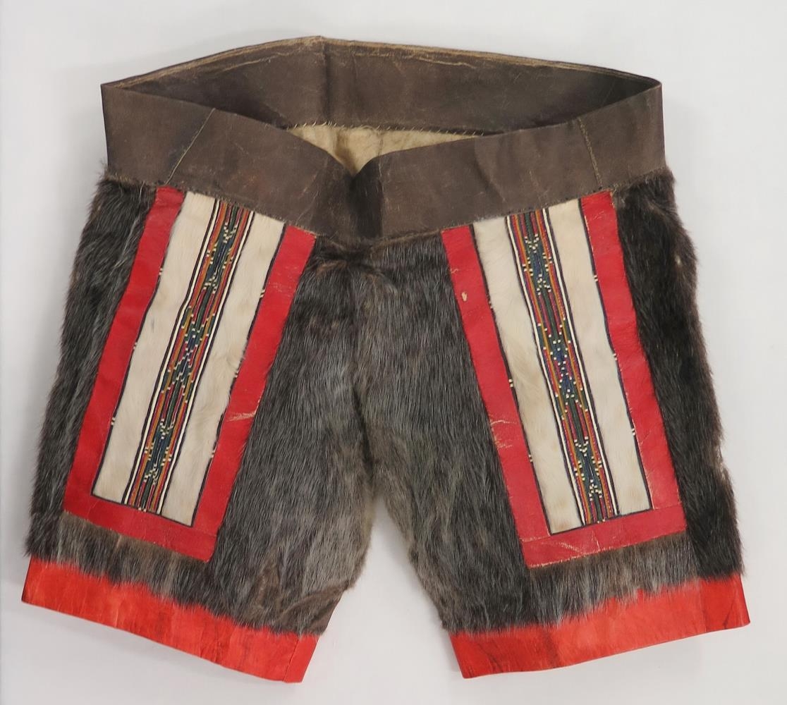 b) Buxurnar eru úr gráu, órökuðu selskinni, ófóðraðar. Strengurinn er tvöfaldur, rakaður, um 5 cm. breiður., innanmál 83 cm. Skálmarnar eru 28,5 cm. að lengd að framan, og rautt , rakað selskinn neðst. 3,5 cm. breitt. Framan á skálmunum er 22. cm. langt og 11 cm. breitt skrautstykki úr rauðu skinni, neðst og yst beggja vegna, í miðju, langsum, er 2,7 cm. breiður skrautbekkur með margvíslega litum röndum, skinnræmum sem mynda fagran uppdrátt, en beggja vegna við eru hvítir skinnborðar, um 2 cm. að breidd, hærðir. Innanmál skálmanna neðst er 41,5 cm. Að aftan eru buxurnar 39 cm. niður frá streng. Engin klauf er á stakk né buxum.