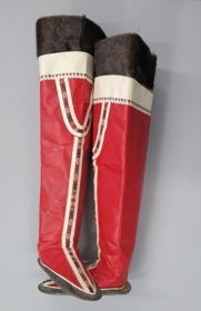 c) Háskórnir eru tvöfaldir, ytra borðið úr rauðu rökuðu selskinni, en hið innra úr órökuðu gráu, og snúa hárinn inn. Brúnt (sel?) skinn er nær efst, breidd 8,2-9,5 cm. og þar fyrir neðan er 6 cm. breiður hvítur borði, rakaður, skreyttur neðst, að framan gengur sem skeifa niður á hnéð og síðan beinn borði allt fram á tá, og eru bæði með skrautlegur verki. 13 að aftan 60 cm. innanmál efst 49 cm. Skólengd að neðan 24,5. Búningurinn er nýr og ónotaður. (M.Þ.)