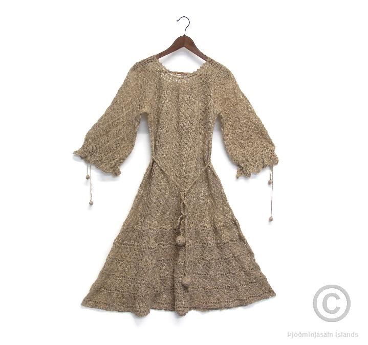Prjónakjóll úr einspinnu (eingirni), ljósbrúnn (ljós rauðmóleitur eða ljósljósmórauður) á lit. Kjóllinn nær niður fyrir hné (sídd er 107 cm), með ermum sem ná lítið eitt niður fyrir olnboga. Í mittið er laust belti, snúra með dúskum á endum (heklað utan um plastkúlur). Fremst á ermum eru einnig snúrur til að rykkja ermum saman og á endum snúranna eru sams konar kúlulaga dúskar en minni (helklað utan um trékúlur). Kjóllinn er eftir Aðalbjörgu Jónsdóttur. Hann er í mjög góðu ástandi. Yfir kjólinn var borin ullarkápa nr. Þjms. 2012-2-1.