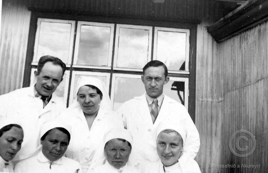 Læknarnir Guðmundur Karl Pétursson og Árni Guðmundsson ásamt fimm hjúkrunarfræðingum utan við spítalann í Spítalavegi.