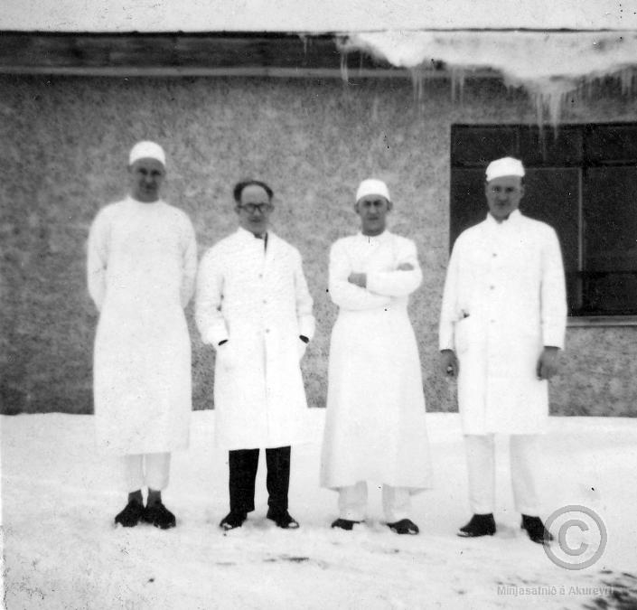 Fjórir læknar í fullum skrúða standa úti, bak við spítalann í Spítalavegi 13