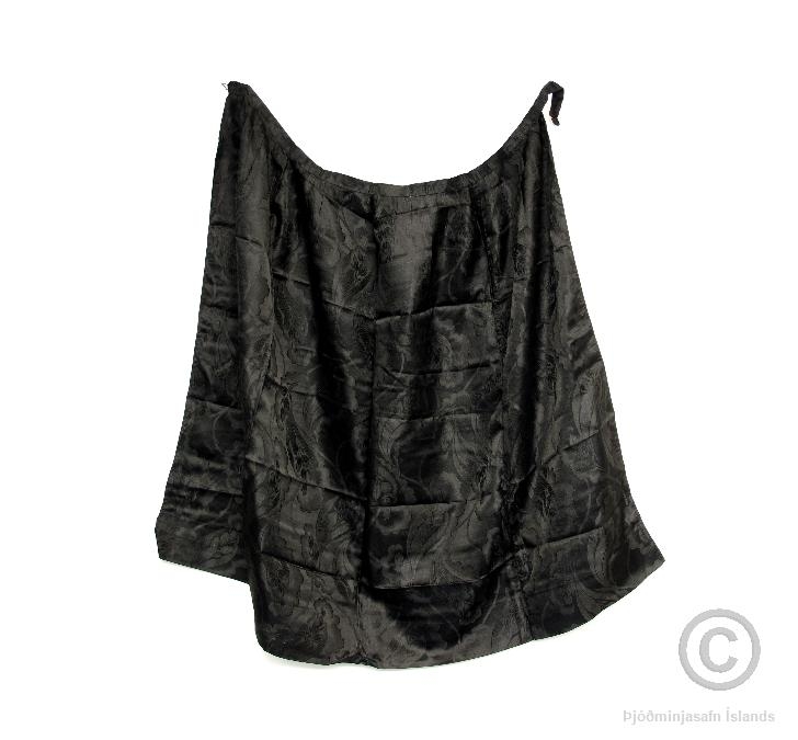 Peysufata- eða upphlutssvunta úr svörtu silkidamaski, 81,5 cm síð og um 115,5 cm breið að neðanverðu. Hefur verið hneppt hægra megin að aftan en nú er hnappurinn glataður. Á svuntunni eru nokkur smá göt. Á tveimur stöðum eru viðgerðir, stagað í götin og lítil, ferhyrnd stykki fest undir. Svuntan er úr eigu Guðríðar Þórarinsdóttur, húsfreyju á Blómsturvöllum í Fljótshverfi á árunum 1903-1947.