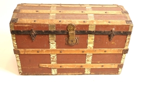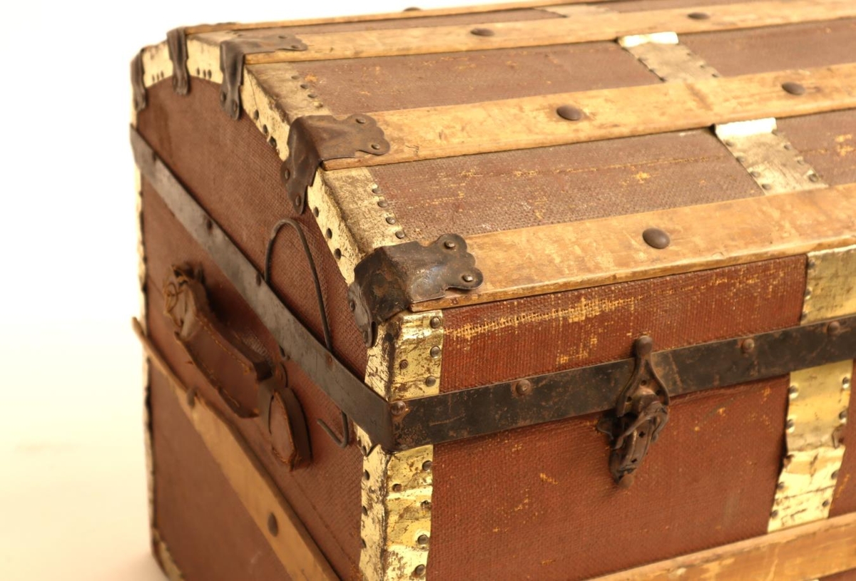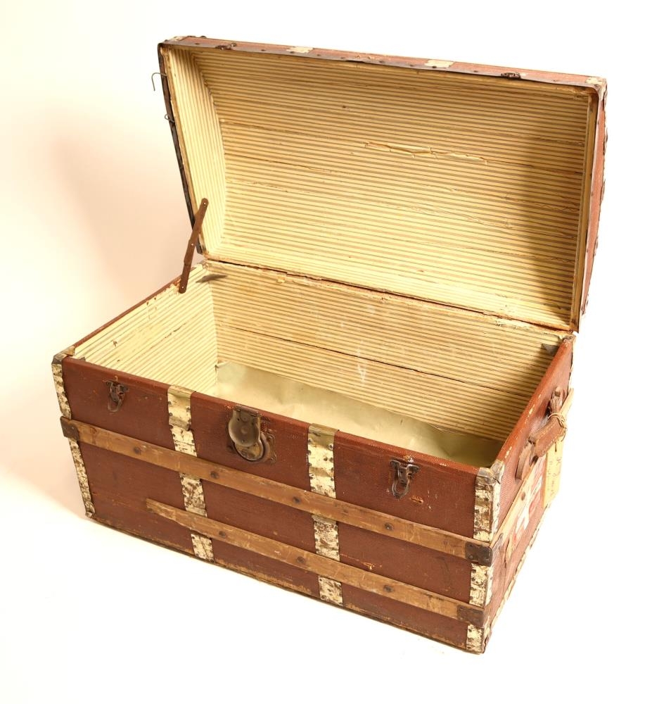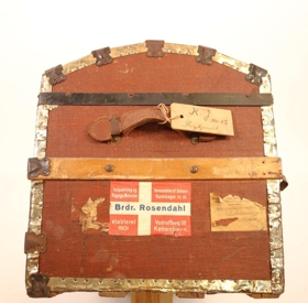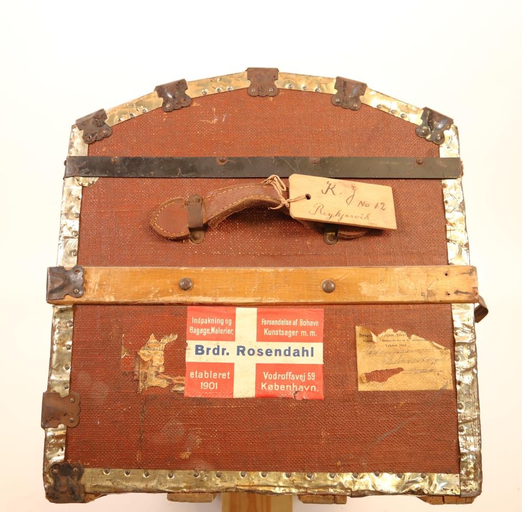Koffort; klætt brúnlituðu strigaefni í grunninn, en styrkt með þverböndum úr tré, bæði á loki og hliðum. Einnig styrkingar á hornum úr járni, svo og svartlituð gjörð úr járni sem nær utan um koffortið ofarlega. Lás úr járni. Á koffortinu má sjá merkingar af ýmsum toga; tréspjald fest við leðurhandfang sem á stendur handskrifað: "K.J. No 12 Reykjarvik". Einnig tveir miðar úr pappír; límdir á hlið koffortsins. Annar þeirra er í grunninn danski fáninn, en prentuð áletrun á honum segir: "Indpakning og Bagage, Malerier, Forsendelse af Bohave Kunstsager m.m. Brdr. Rosendahl etableret 1901 Vodroffsvej 59 Köbenhavn.". Að innan er koffortið klætt að hluta til með (vegg)fóðri; ljóst með gráum röndum.