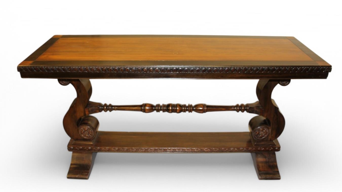 Lágt stofuborð, sófaborð, úr mahogany. Borðið er aflangt á tveimur fótum með þverslám á milli, sú efri er rennd en sú neðri er breið fjöl með skraut-bekk á hliðunum, allan hringinn. Fæturnir eins og S í laginu með Tudor rósinni á endanum. Skrautbekkur á köntum borðplötunni.