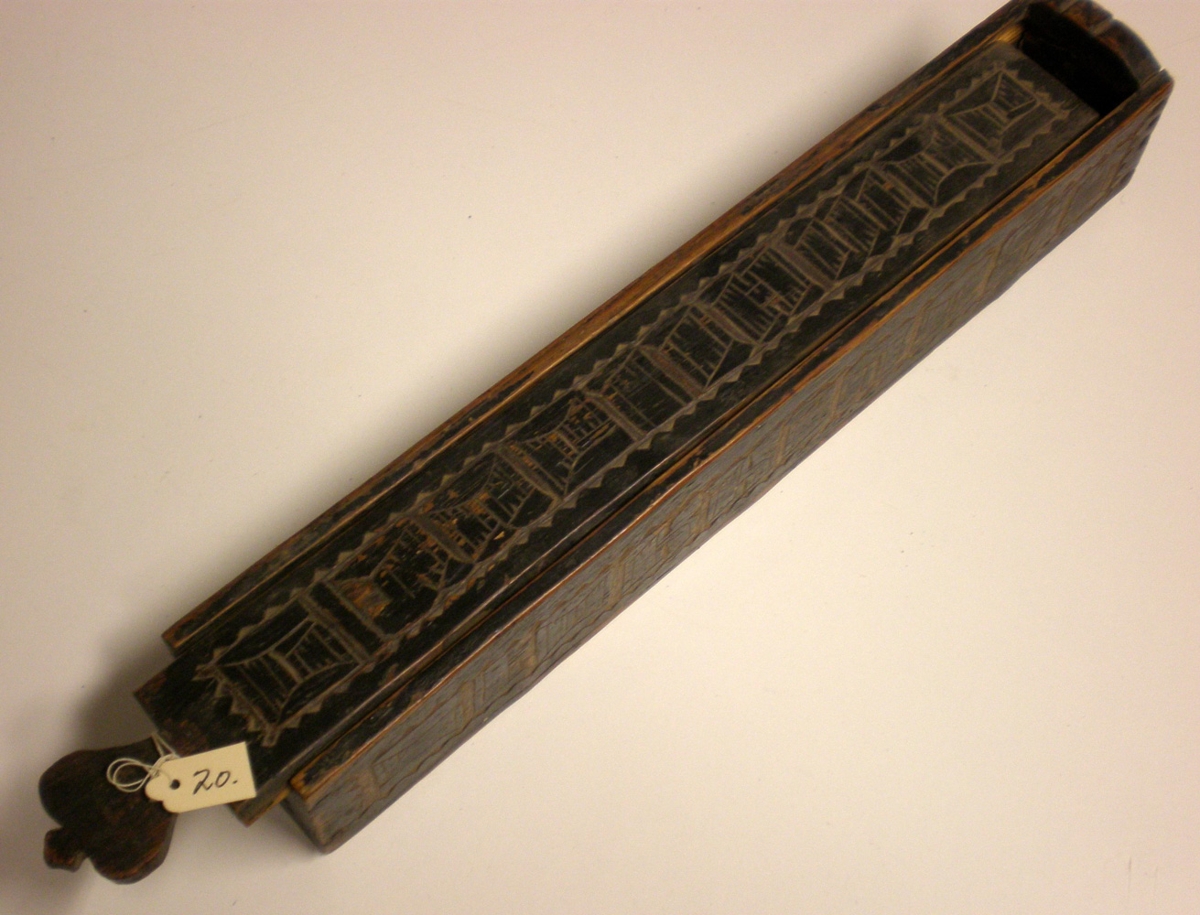 Prjónastokkurinn er 32,5 cm á lengd, breidd og hæð 5 cm. Á hann er skorið með höfðaletri: Dómhildur Gísladóttir á stokkinn. Hún var kona Klemensar Baldvinssonar, bónda í Hundadal í Dalasýslu. Ártalið 1886 er grafið í annan endann. Stokkurinn er litaður svartur og í aðfangabók stendur að hann sé ekki vel útskorinn.
