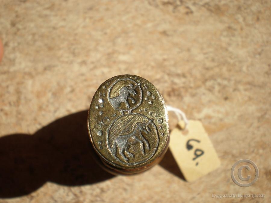Signetið er gamalt og því eru tvær myndir, virðast vera af einhyrningum. Signetið er eirlitað með tréhandfangi.