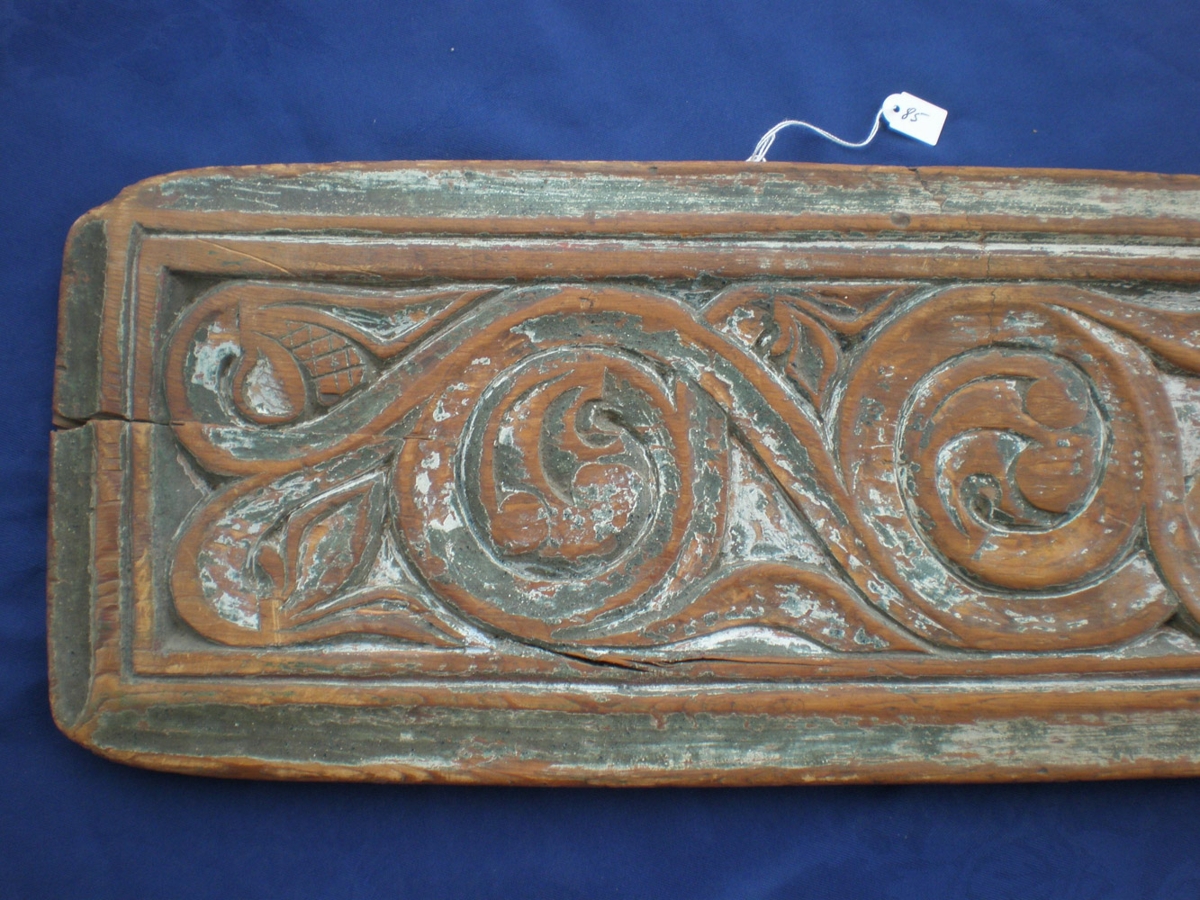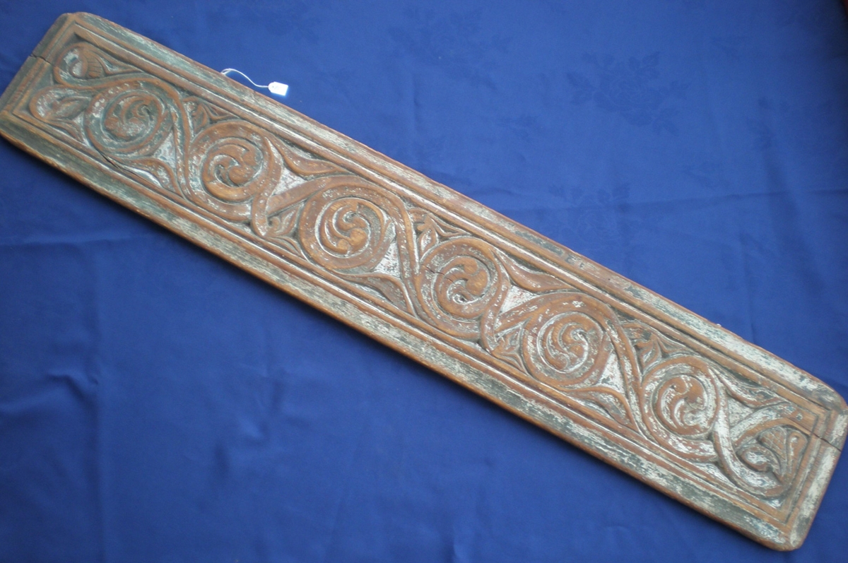 Rúmfjöl úr furu, útskorin, lengd 117, breidd 22 cm. Til hliðanna eru hefluð strik og á milli þeirra skrautborði. Fjölin er frá lokrekkju í Hlíðarfæti í Svínadal. Þær voru upphaflega þrjár og á einni var ártalið 1707. Fjölunum skiptu á milli sín þrjár systur.