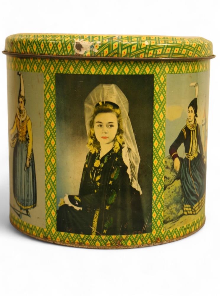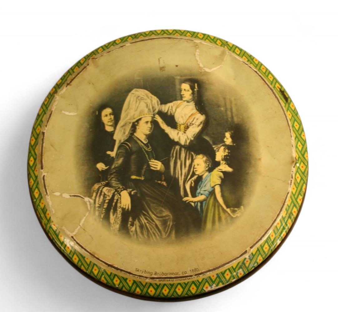 Blikkbox, kökubox með myndum af konum í íslenskum þjóðbúningum.