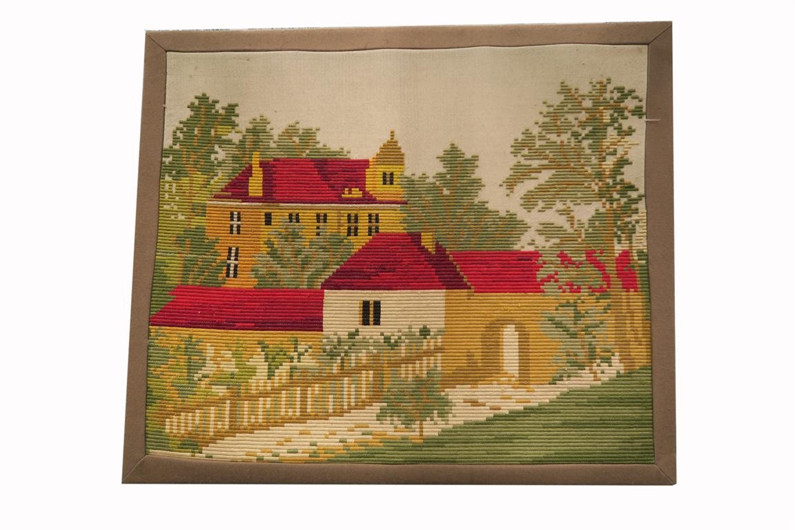 Veggteppi með tréramma. Erlent borgarumhverfi, hús og tré.
