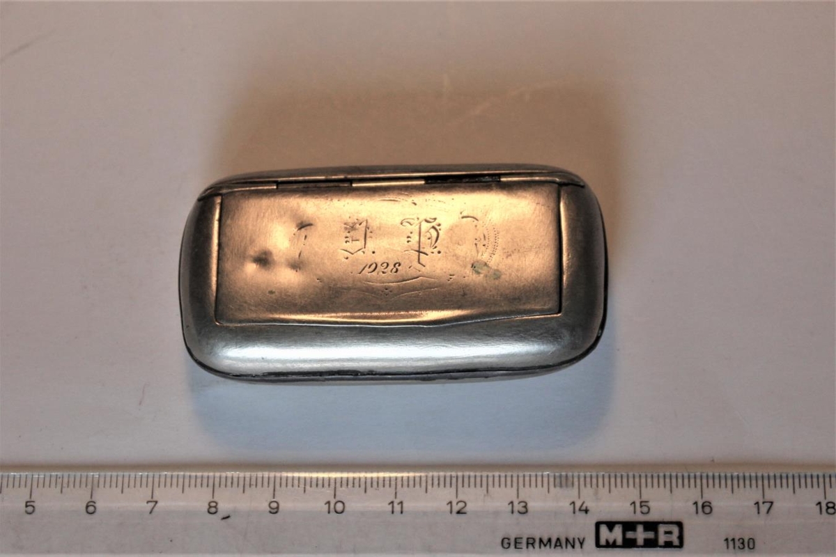 Tóbaksdósir úr silfri (fremur en nýsilfri?). Lokhjarir bilaðar. Björgvin taldið þetta tóbaksdósir langafa síns, Jóns Þorsteinssonar bónda á Eystri-Sólheimum (1822-1897). Á loki er máð áletrun J.Þ. en einnig ártal, 1928 og ætti þá að vera grafið mun síðar en fangamarkið, enda skýrara.