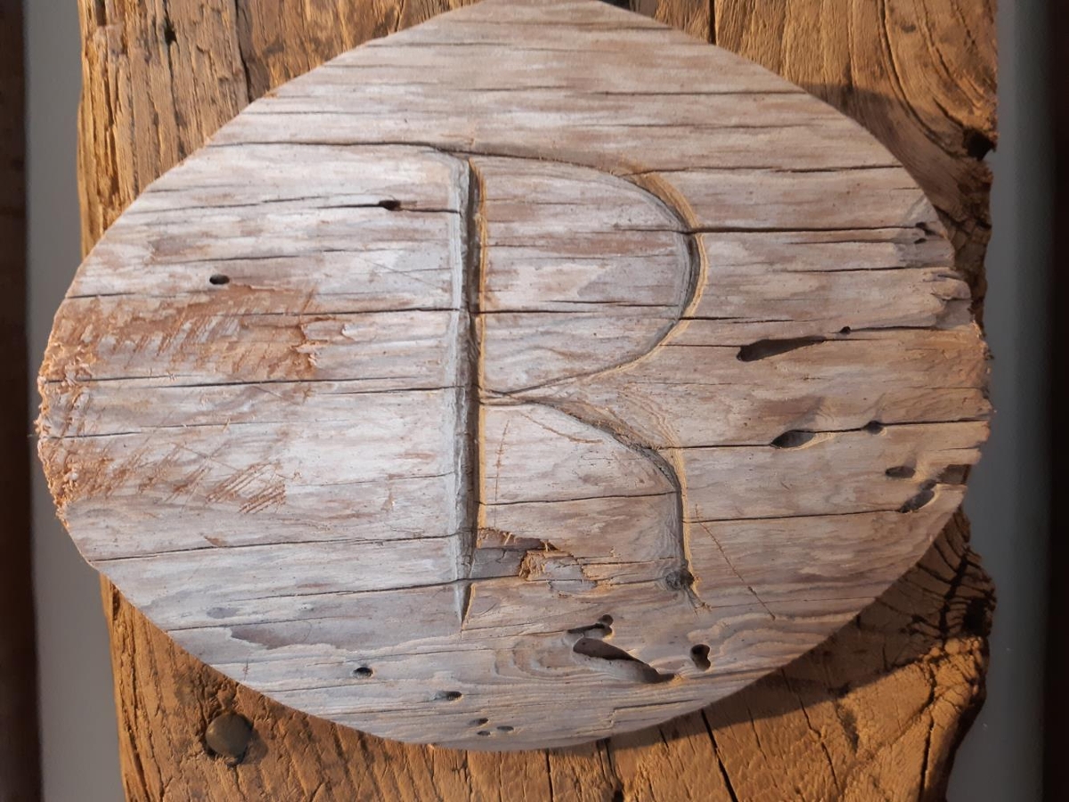 Í aðfangabók er jafnframt miði með texta frá Lárusi Helgasyni: Mæniásinn í helluþakshúsinu á Löngurofum er 17 álna rekatré (rótartré) sem pabbi keypti á sínum tíma af Ragnhildi á Rauðabergi. Og þar var auðvitað að finna þetta lipurlega skorna R.