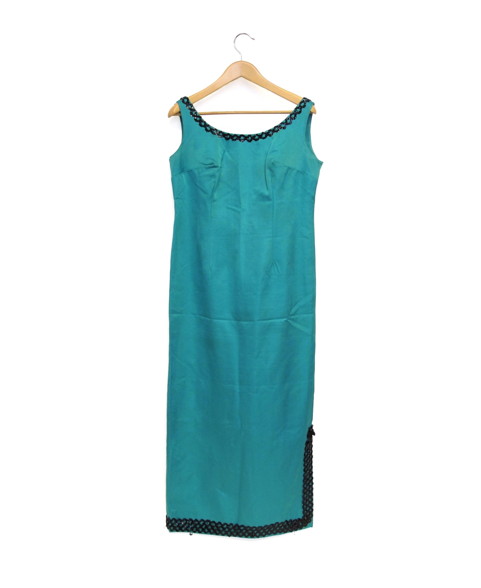 Grænblár (túrkisblár) síðkjóll, ermalaus, með svörtu pallíettumynstri við hálsmál og neðst við fald. Vinstra megin að neðan er um 35 cm há klauf og pallíettumynstrið er einnig með brúnum hennar. Kjóllinn er úr satínefni, um 138 cm síður frá öxl. Hann er renndur í bakið og er ófóðraður. Á hlýrum innanverðum eru festingar til að festa þá við hlýra brjóstahaldarans. Kjóllinn virðist hafa verið tekinn út / víkkaður í hliðum. Hann er gerður á saumastofunni Gullfossi í Reykjavík og er merktur: Gullfoss tizkuvörur. Í viðtali við Ragnar Þórðarson, einn eigenda saumastofunnar, í Fálkanum árið 1962, segir m. a.: