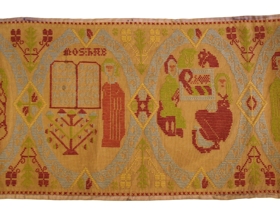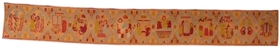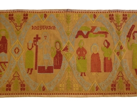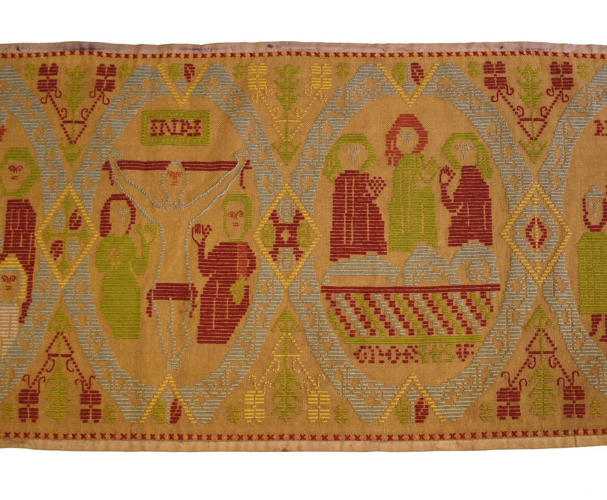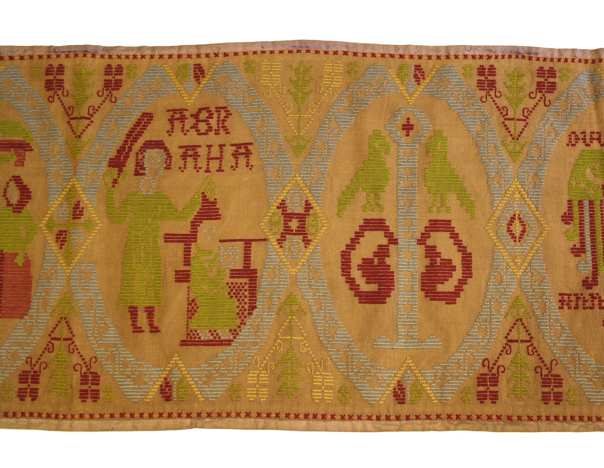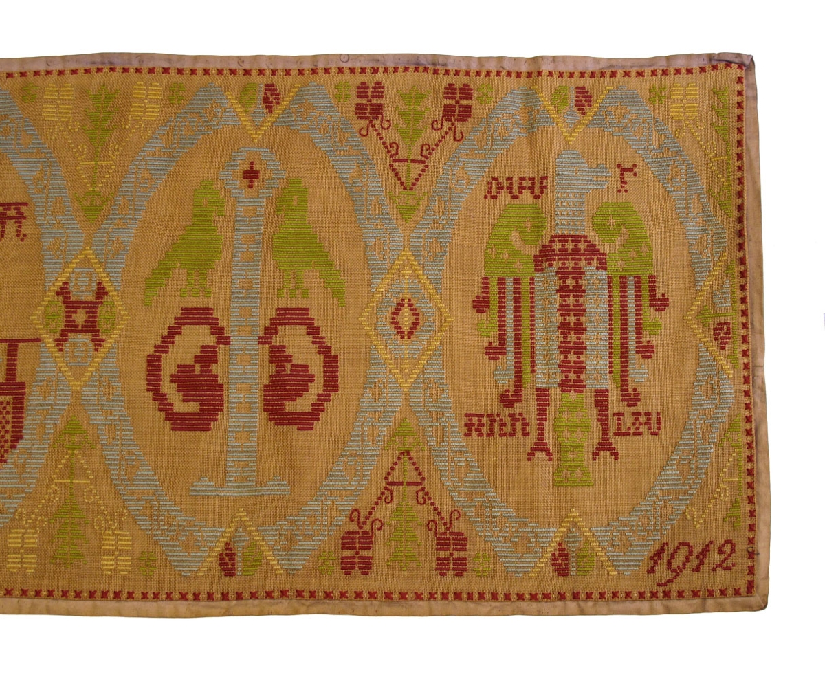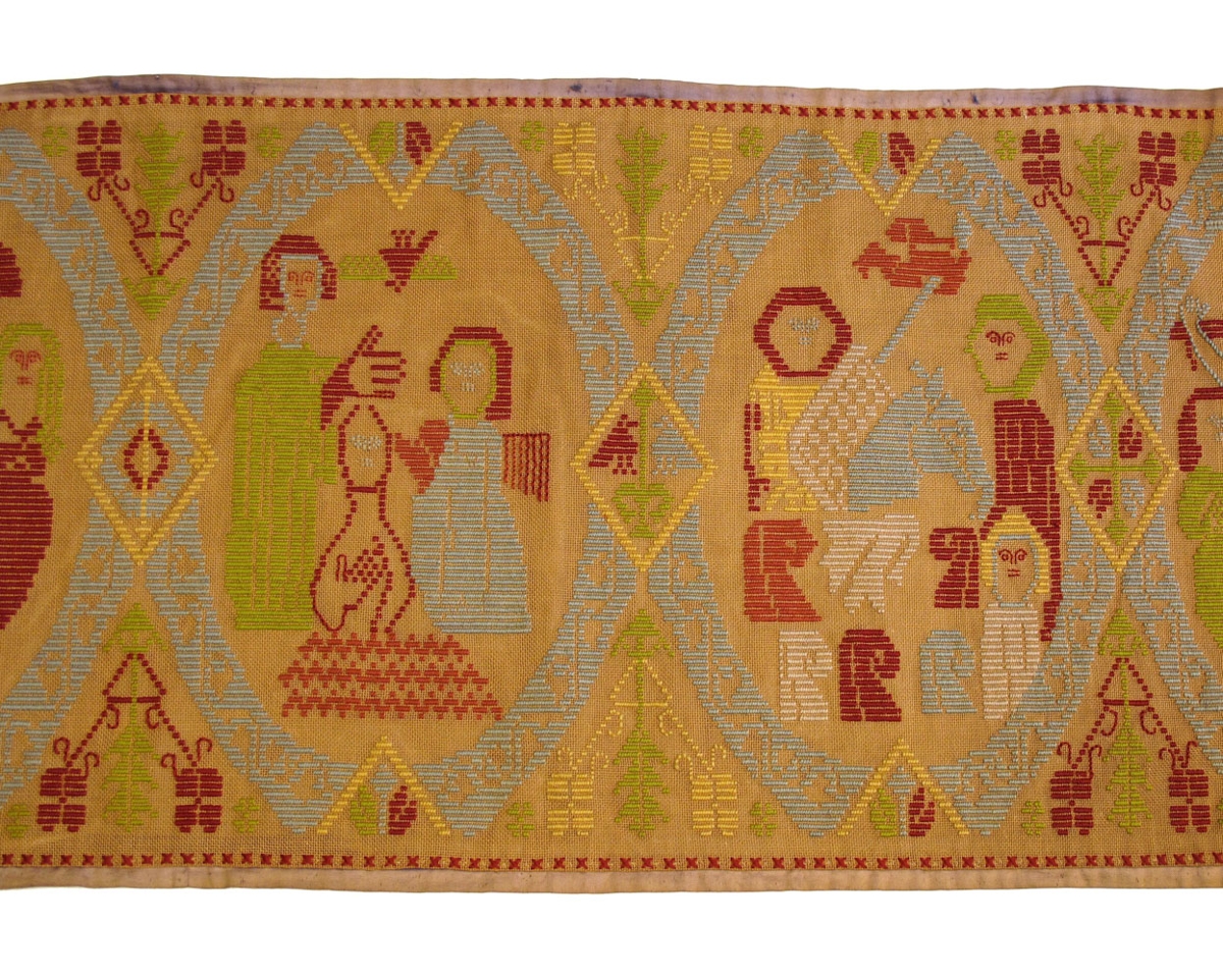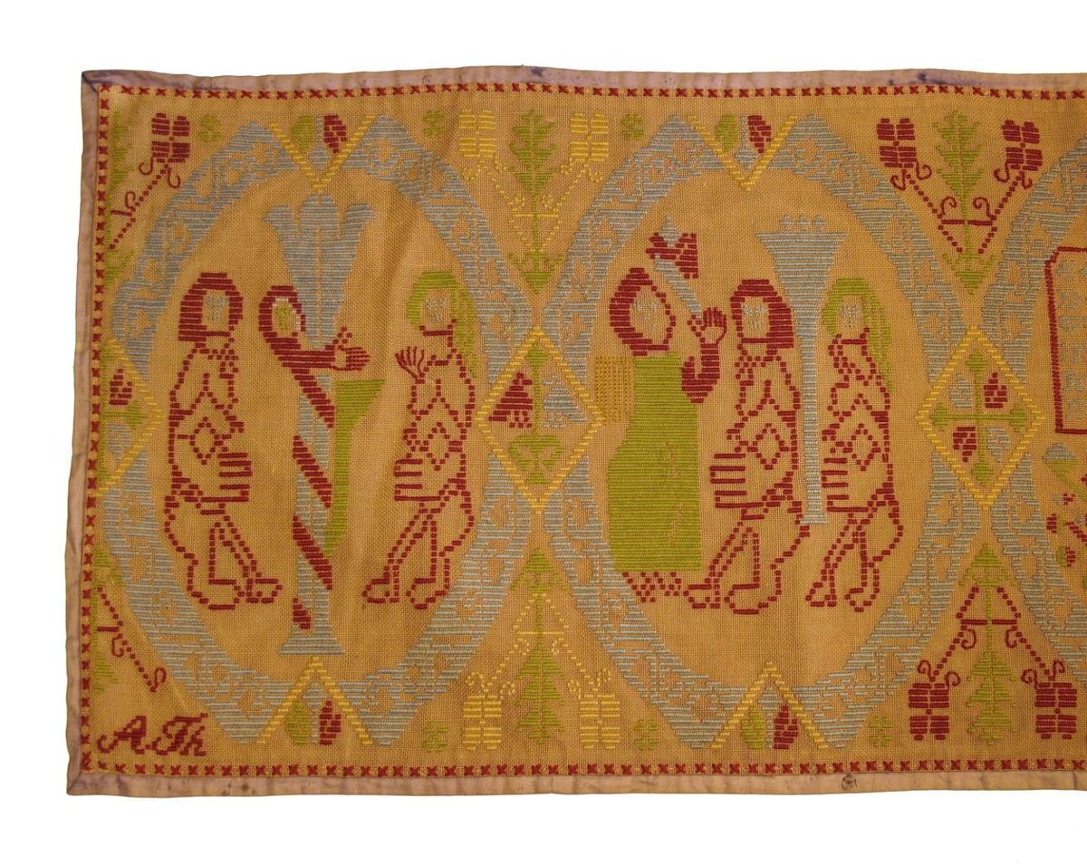 Veggtjald (veggteppi), 395 cm langt og 52 cm hátt. Það er útsaumað með glitsaumi, myndum af textílum sem varðveittir eru í Þjóðminjasafninu. Sú sem saumaði tjaldið sat við útsaum í Safnhúsinu árið 1912, taldi út mynstur og saumaði eftir textílum sem þar voru til sýnis. Myndirnar mætti því rekja saman við fyrirmyndirnar. Munstrin eru saumuð í ljósbrúnan ullarjafa, með gulu, rauðu, grænu og bláu ullargarni. Við brúnir hefur verið saumuð fjólublá satínrönd. Litirnir allir eru orðnir mjög upplitaðir. Tjaldið hefur því augljóslega hangið lengi þar sem sól hefur skinið á það. Það er annars heilt og í góðu ástandi. Í hægra horn að neðanverðu er saumað ártalið 1912 og í vinstra horn að neðanverðu upphafsstafirnir A Th. Þetta eru upphafsstafir Ölmu Thorarensen, langömmu gefanda (fædd Alma Clara Margrethe Schiöth, f. 1867, d. 1949). Eiginmaður hennar var Oddur Carl Thorarensen lyfsali (f. 1862, d. 1934). Tjaldið er fóðrað með hvítu lérefti.