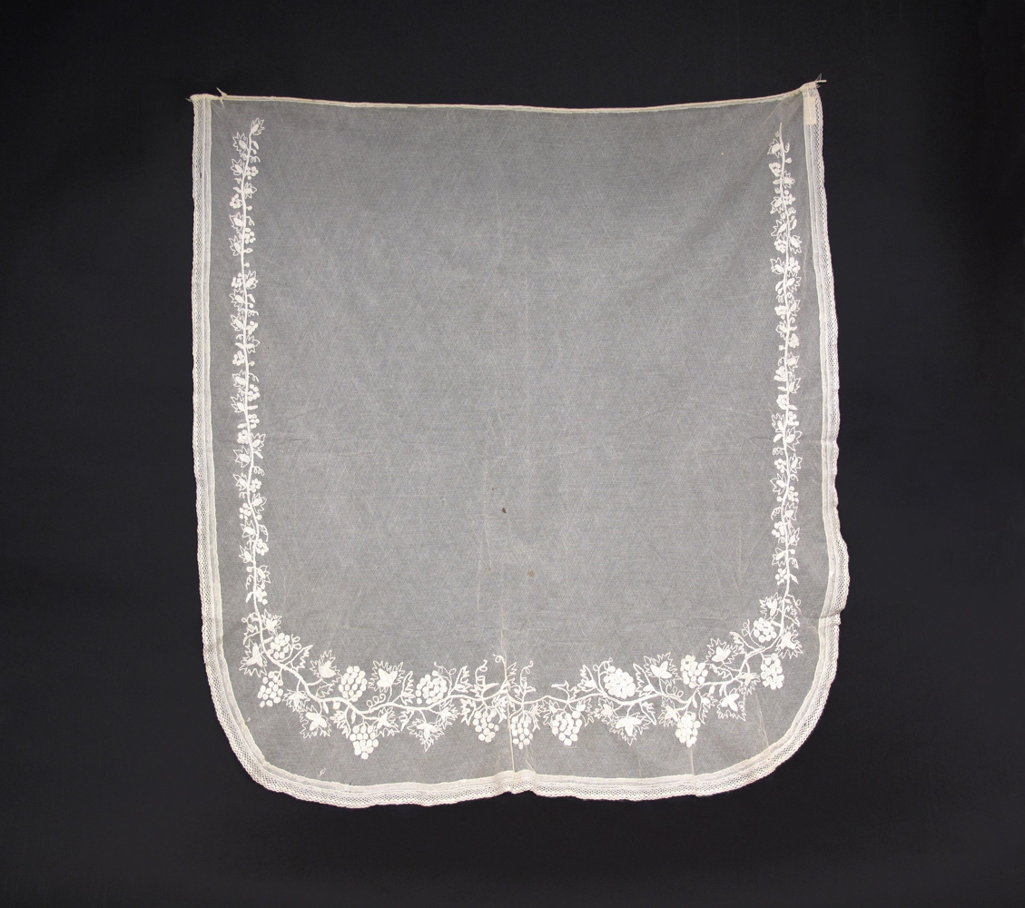 Blæja / faldblæja / slör úr hvítu bjómullartjulli. Brydd á þrjá vegu með fremur mjórri bómullarblúndu. Í tjullið er þrætt / saumað blómamynstur með hvítum bómullargarni. Örfáir smáir blettir eru í blæjunni en annars er hún í mjög góðu ástandi.
