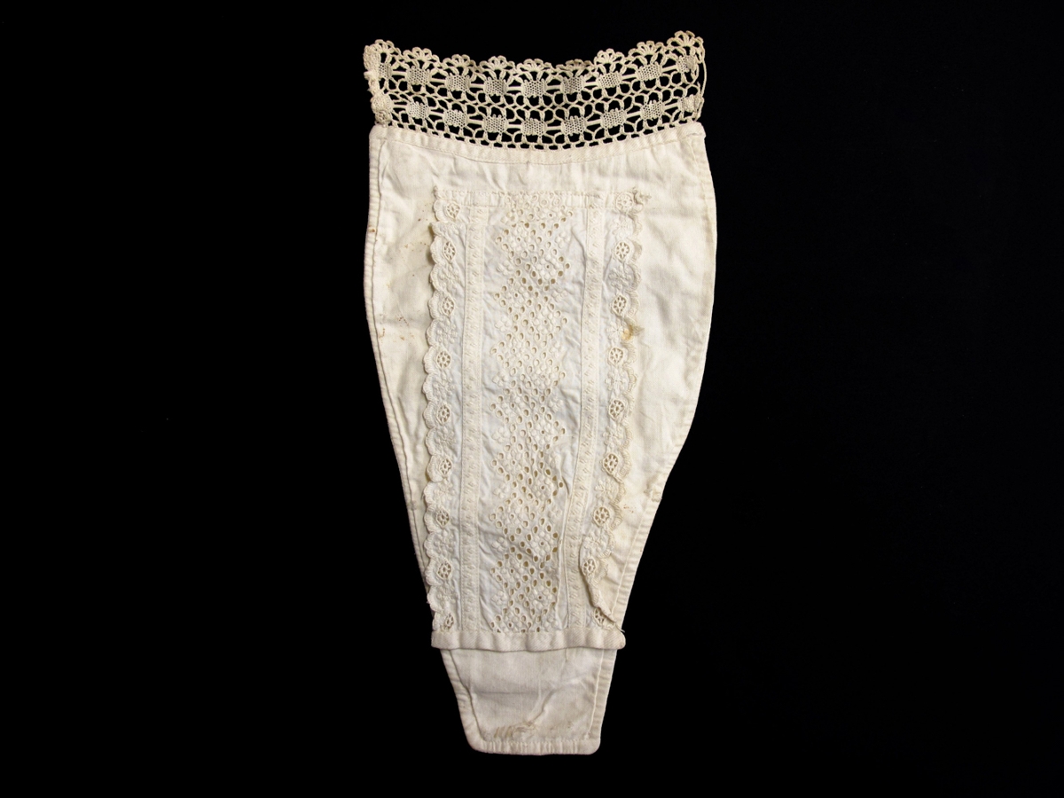 Peysubrjóst úr hvítu lérefti, með hvítri kniplaðri blúndu efst en með vélsaumuðum blúndubekk að framan. Var borið undir skauttreyju. Brjóstið er ekki stífað.