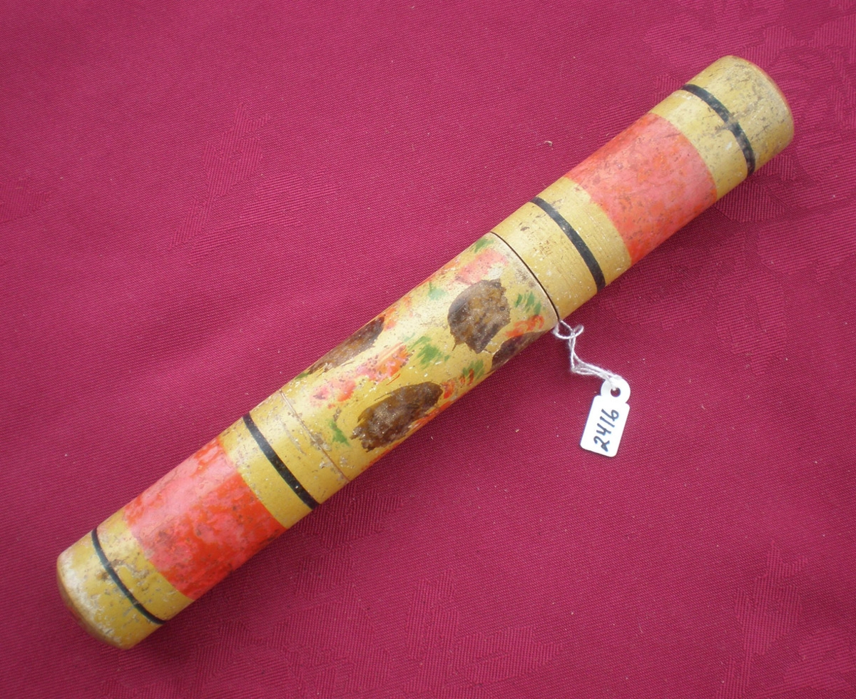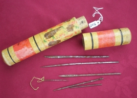 Nálhús úr tré, málað, með sex nálum þ.m.t. rúllupylsunálum. Nálhúsið er stórt, 23.5 cm.