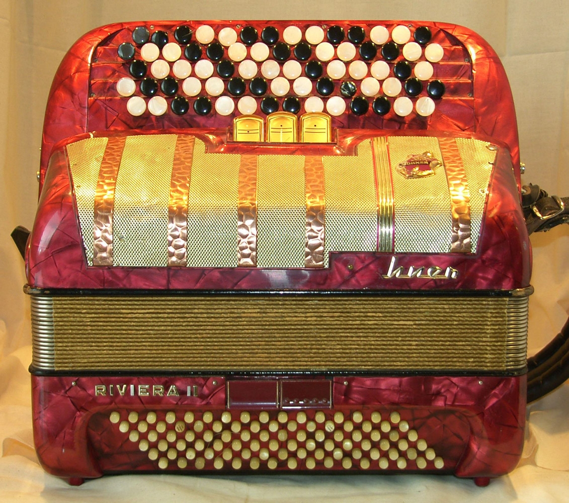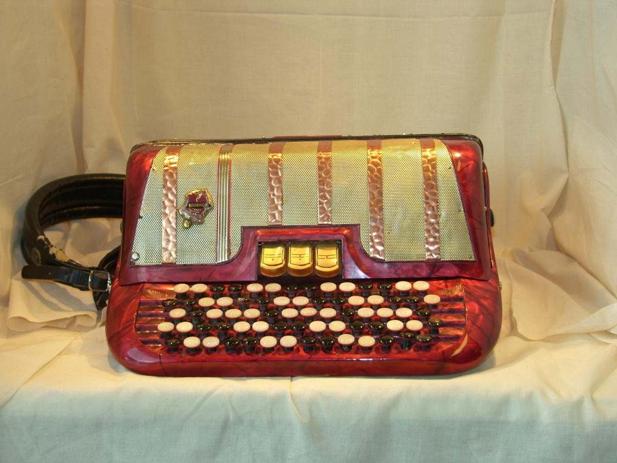 Rauð hnappaharmonika af HOHNER RIVIERA II gerð, með tröppuborði og sænsku gripi. 72 nótur í diskant og 96 í bassa, 2 kóra og 3 skiptingar. Framleidd í Þýskalandi.