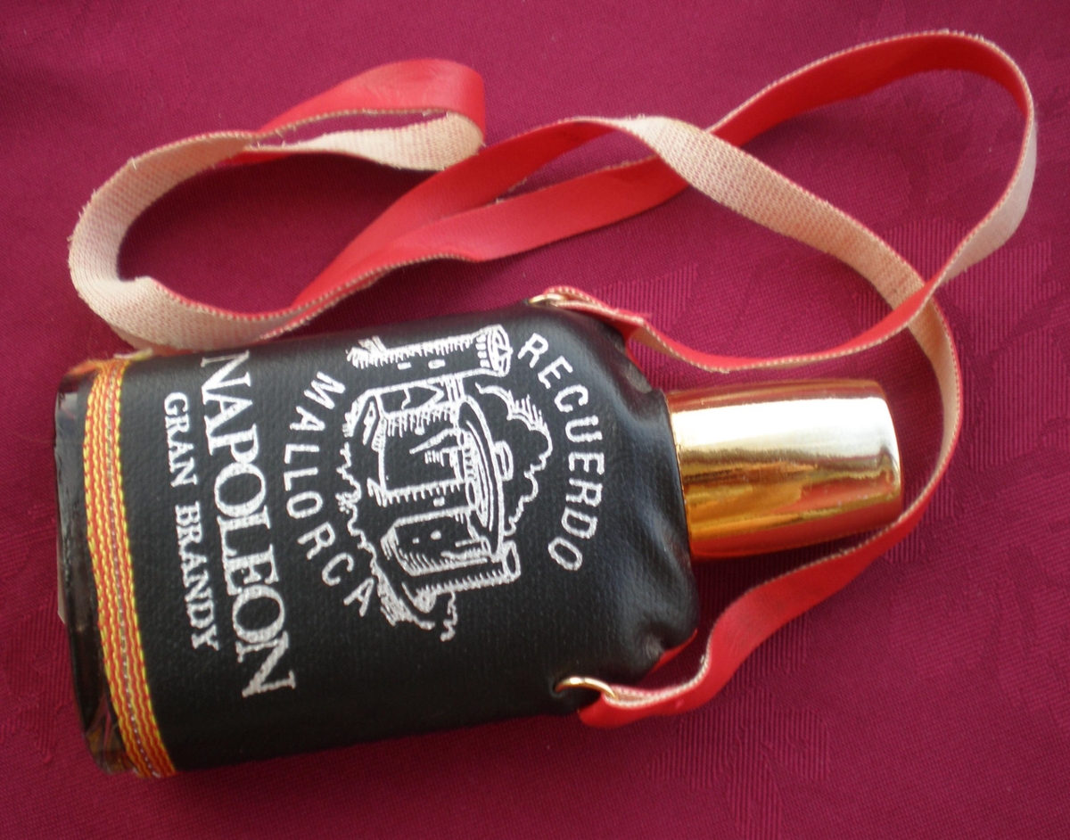 Vasapeli með drykkjarhettu og í hulstri með ól. Þetta er óátekin flaska af Napoleon Gran Brandy, merkt Mallorca. Úr dánarbúi,Þorsteins Jónssonar, Kaðalsstöðum, bróður gefanda.