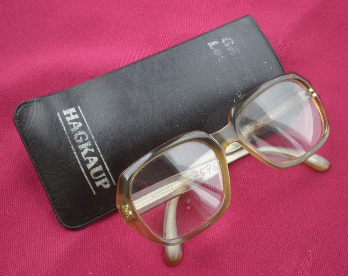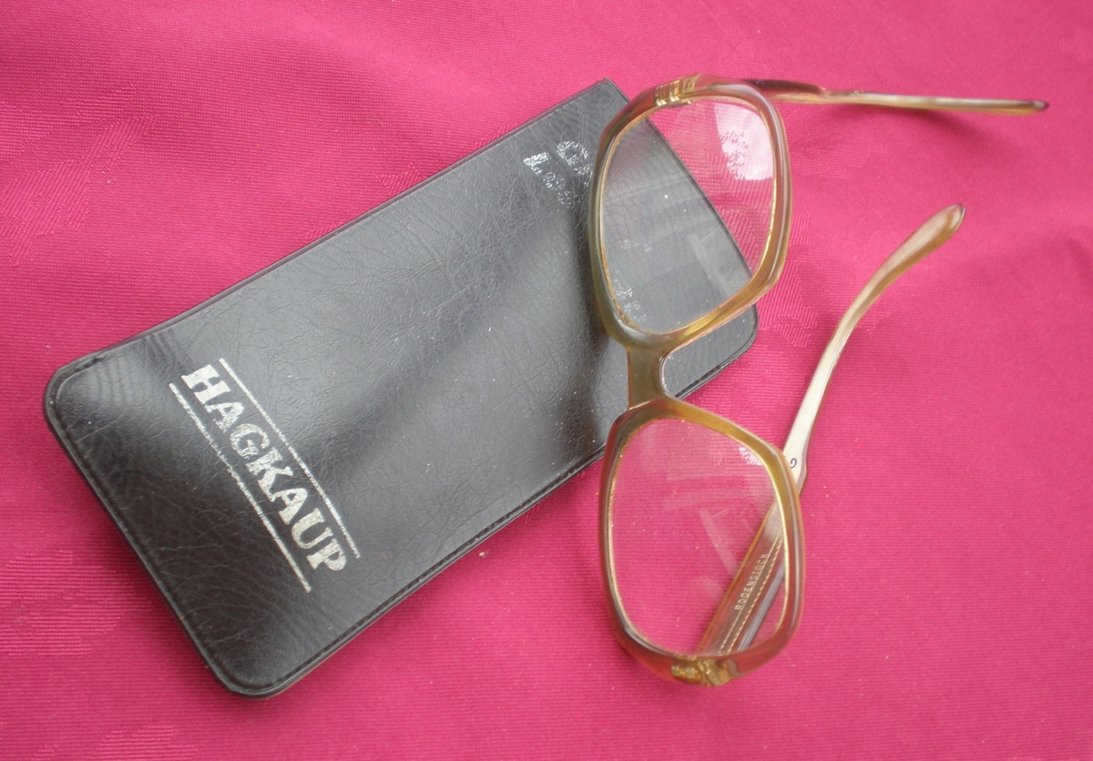 Gleraugu, ca. +3.5, trúlega karlmannsgleraugu í hulstri merktu Hagkaupum. Gætu verið frá um 1975. Úr dánarbúi Þorsteins Jónssonar, Kaðalsstöðum, bróður gefanda.