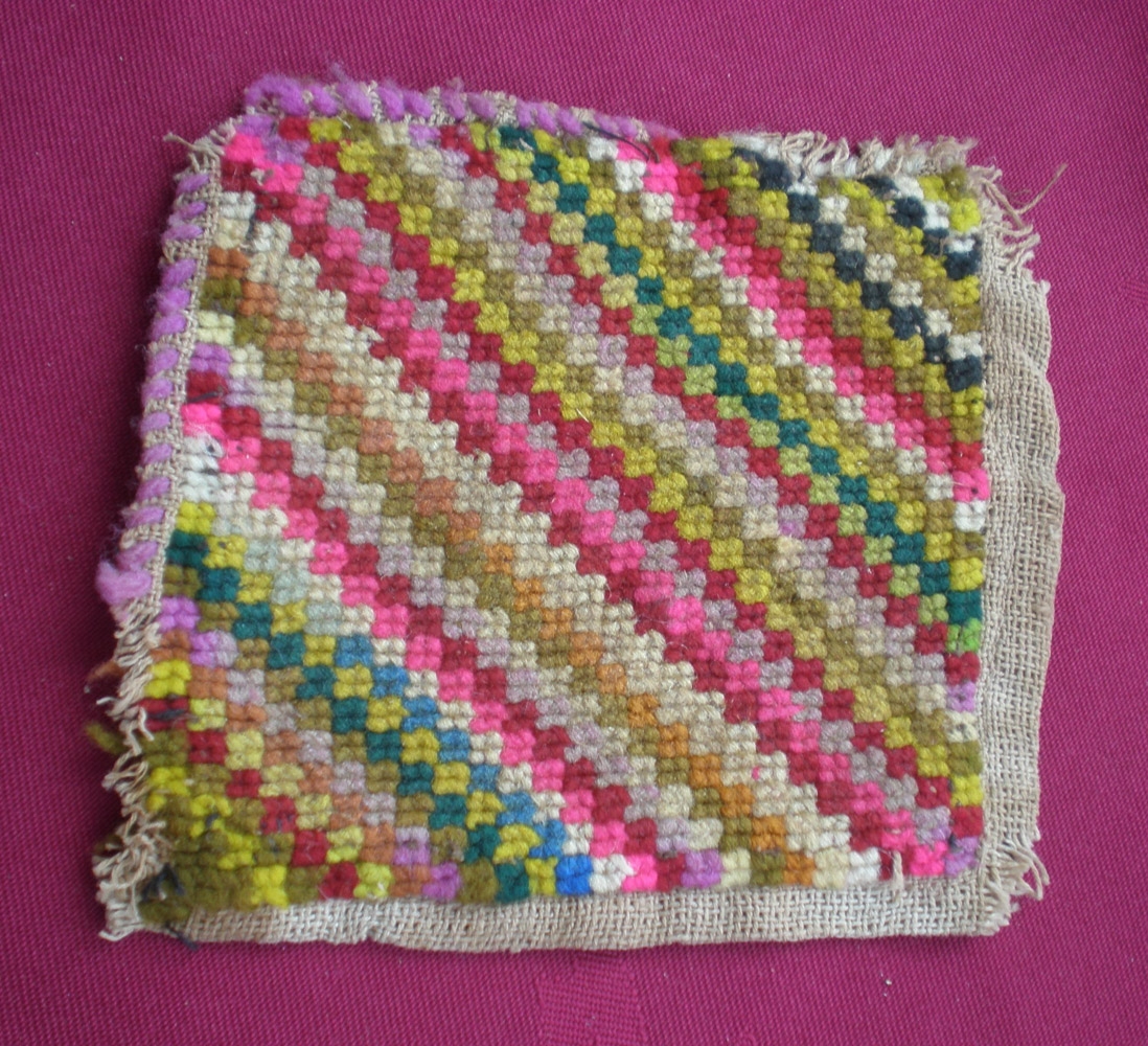 Nálapúðaborð, saumað með krossaumi, skárendur í minnst 12 litum. Stærð 10x10 cm. Úr eigu Ólafar Jónsdóttur, Knarrarnesi, f. 1839. Maður Ólafar, Jón Kristjánsson drukknaði í Hvítá. Ólöf var móðir Jóns Samúelssonar á Hofsstöðum í Álftaneshreppi.