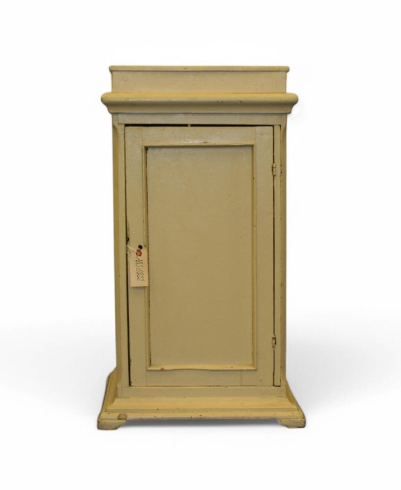 Þvottaservantur úr tré. Lok að ofan, er það er opnað mótar fyrir kringlóttu gati í hilluni, þar sem þvottafatið féll ofan í. Hurð að framan, ein hilla í skápnum fyrir þvottaáhöld.