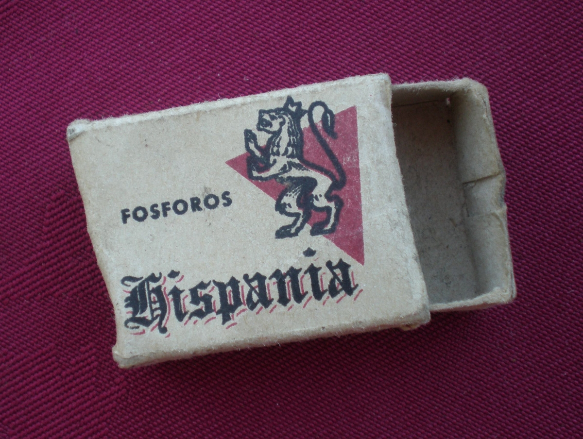 Eldspýtustokkur, tómur úr pappa, á honum stendur: Fosforos Hispania.