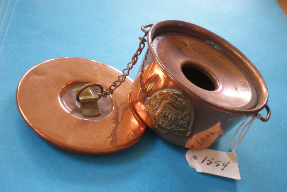 Eftirlíking af pottum úr herbúðum, þvermál loks 6.8 cm. Unnið af stríðsföngum úr fyrra stríði. Úr búi Þóru Sigurðardóttur, móður gefanda.