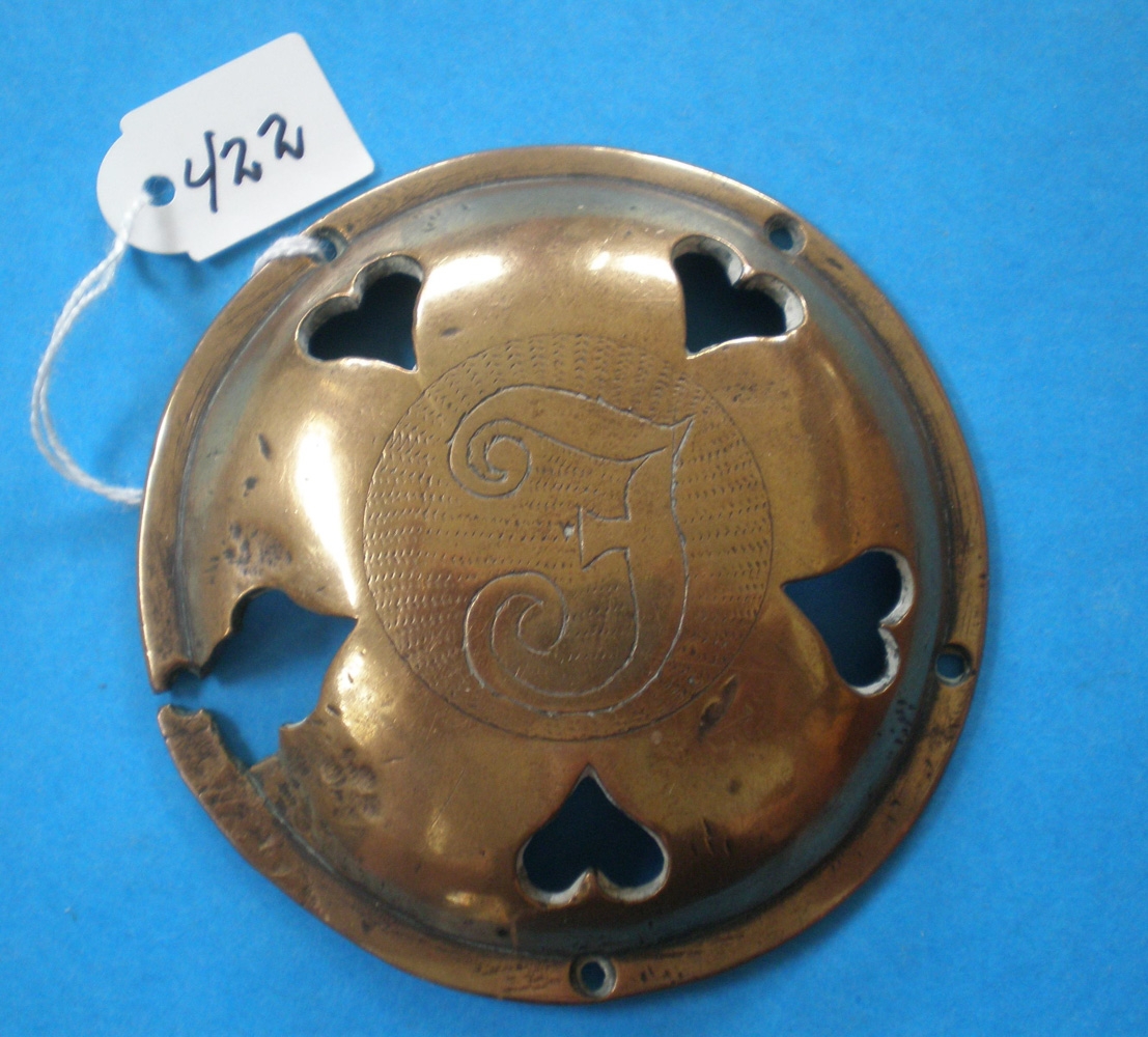 Söðulbóla, steypt úr gylltum málmi, 7.5 cm í þvermál. Fangamark ofan á og 5 hjartalaga göt.