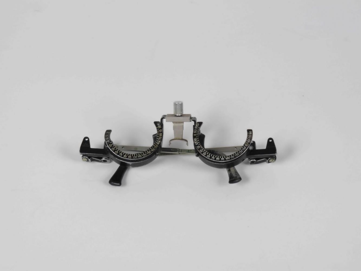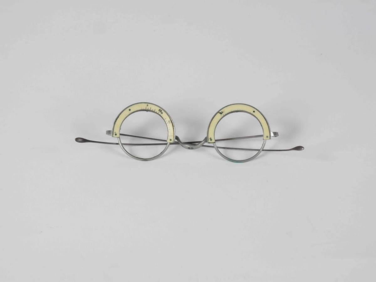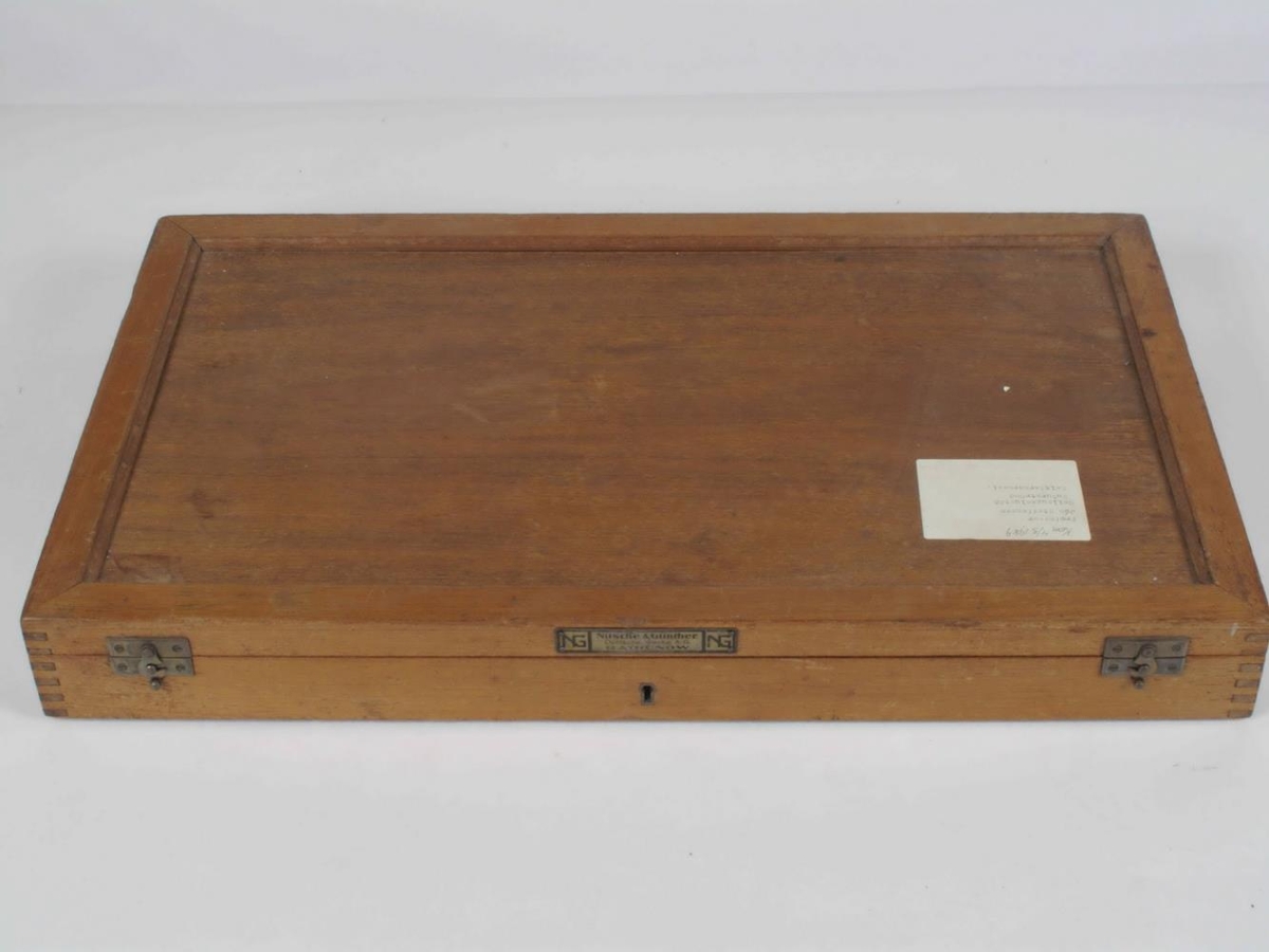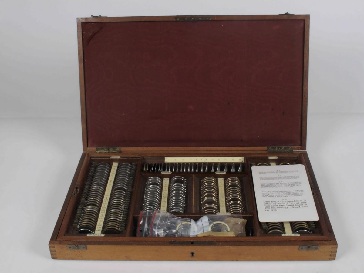 Augnglerjakassi, 56 x 33 x 6,3 sm, úr ljósum viði, látúnshjörum og 2 látúnskrókum og læsingu lykil vantar en sá í NS-2991 á einnig hér við). Framan á loki er fest látúnsplata 8 x 1,5 sm, merkt með svörtum stöfum ... Glerin eru þau sömu og á Stille 1945, ... . Tvær prófglerjahöldur er í kassanum, NS-3485a eins og STille 1945, ... NS 3485b (svört) gerð eins og Stille 1945, ... Í kassanum liggja sjónstykleikatöflur á íslensku, 20 x 12,2 sm (st stk) NS 3485c.