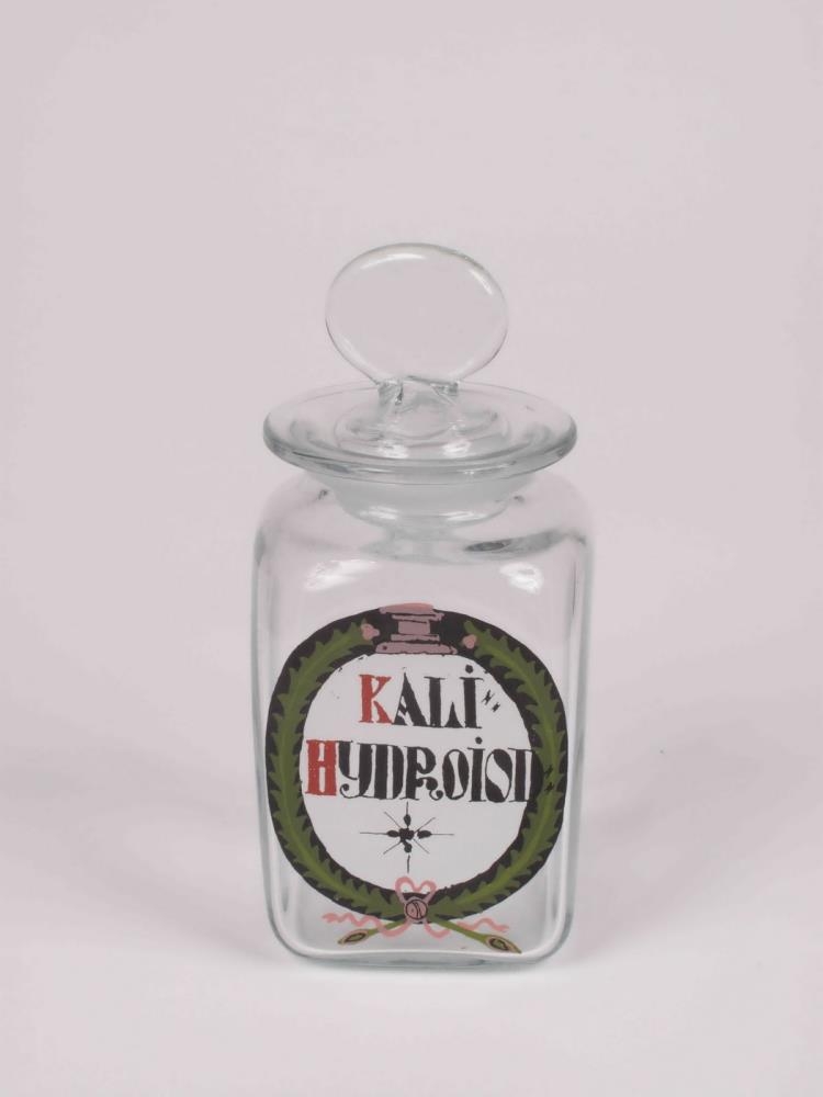 Flaska af sömu gerð og NS 3198 (Ferstrend, úr ólituðu gleri með víðum stút og glertappa) áletruð KALI: HYDOIOD:Merkt HG8 Þessum tveimur HG8 [NS 3198 og NS 3199] fylgdi umslag frá "Augustenborg Apotek /Anno 1799-1935" en í því er upplýsingar um það en ekki frá aldri flaskanna. Lyfjaglasið er nákvæm eftirlíking af fyrirmyndum úr dönskum apótekum gerðum í samvinnu Kastrups og Holmgaards Glasverker A/S og Bang-s Tegner A/S. Hvert þeirra (NS 3196-NS 3202) er á botni merkt H. G. og útgáfuári t.d H.G. 6 = 1976