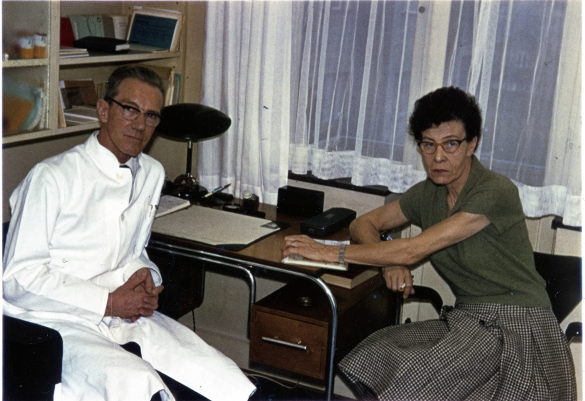 Jóhanna Guðmundsdóttir læknir ásamt eiginmanni sínum Leif Hansen heimilislækni. Myndin er tekin á læknastofu Leifs. Jóhanna sem var fimmta íslenska konan til þess að taka læknispróf frá Háskóla Íslands var aðstoðarmaður Leifs.