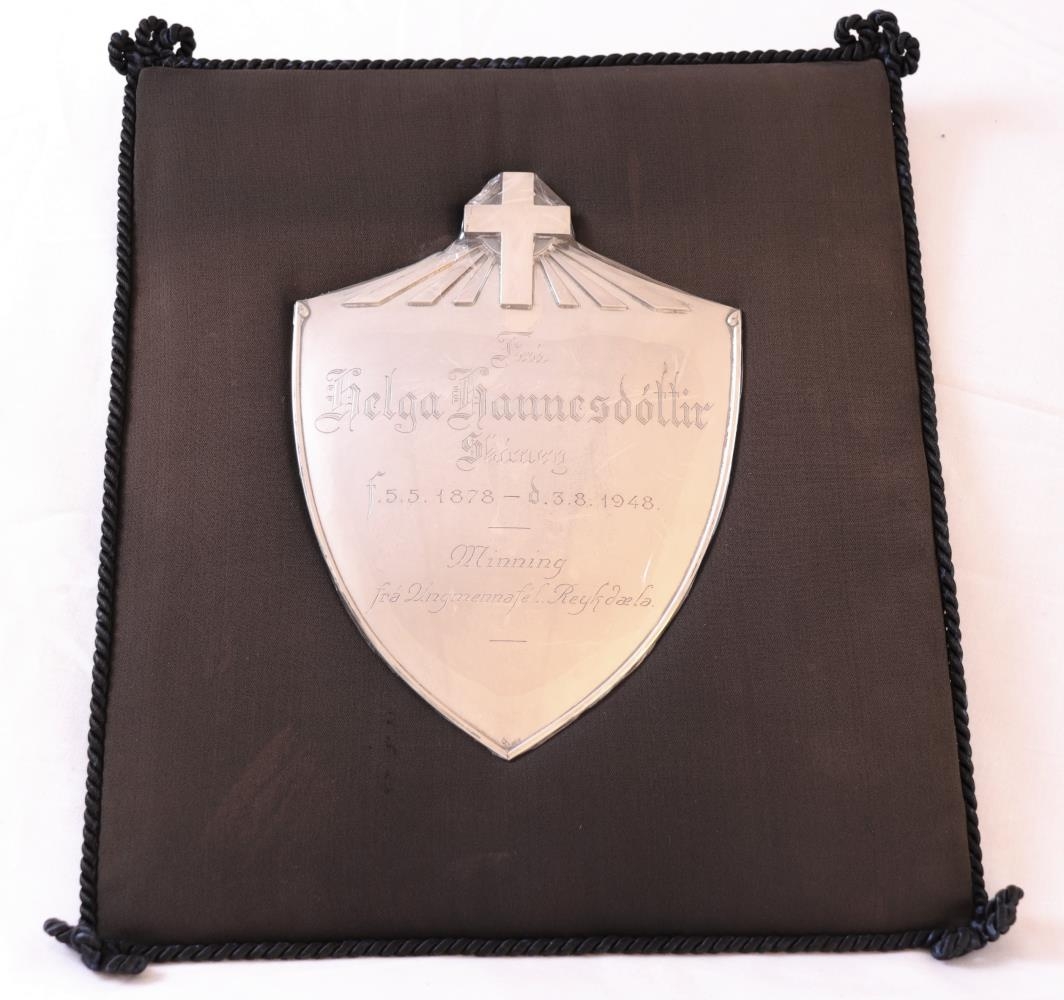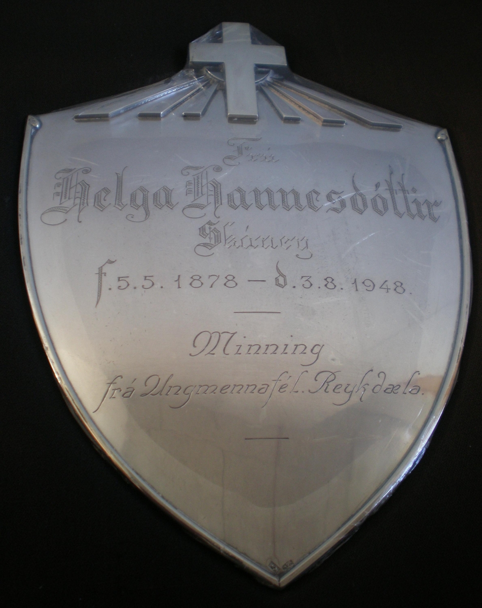 Minningarskjöldur um Helgu Hannesdóttur á Skáney í Reykholtsdal. Hún var móðir gefanda. Skjöldinn gerði Þorgrímur Á Jónsson.