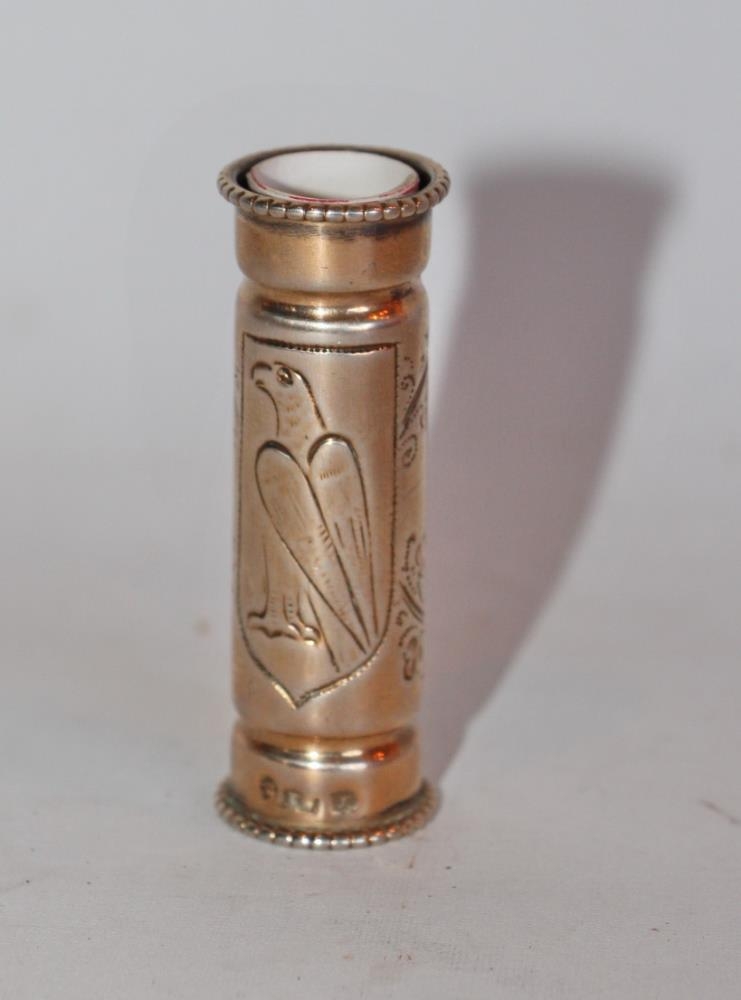 Skúfhólkur úr silfri. Lengd 5,1 cm, þvm. 1,7 cm. Á hólknum er stimpill: SILW og að því er virðist 10. Grafin er mynd á hliðina, af fálka á skildi og utan með eru laufgreinar (4). Snúrur eru á brúnum.