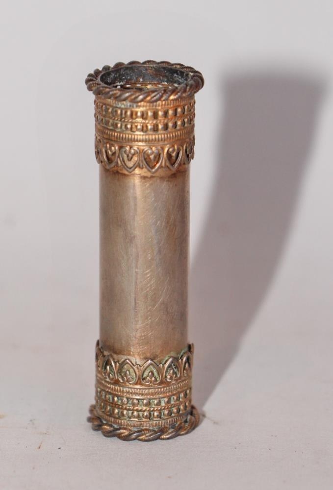 Skúfhólkur úr silfri. Lengd 5 cm, þvm. 1,6 cm. Á sitt hvorn enda eru festir (tinaðir á) kransar með hjartamynstri á annarri brún og snúru á endabrún.
