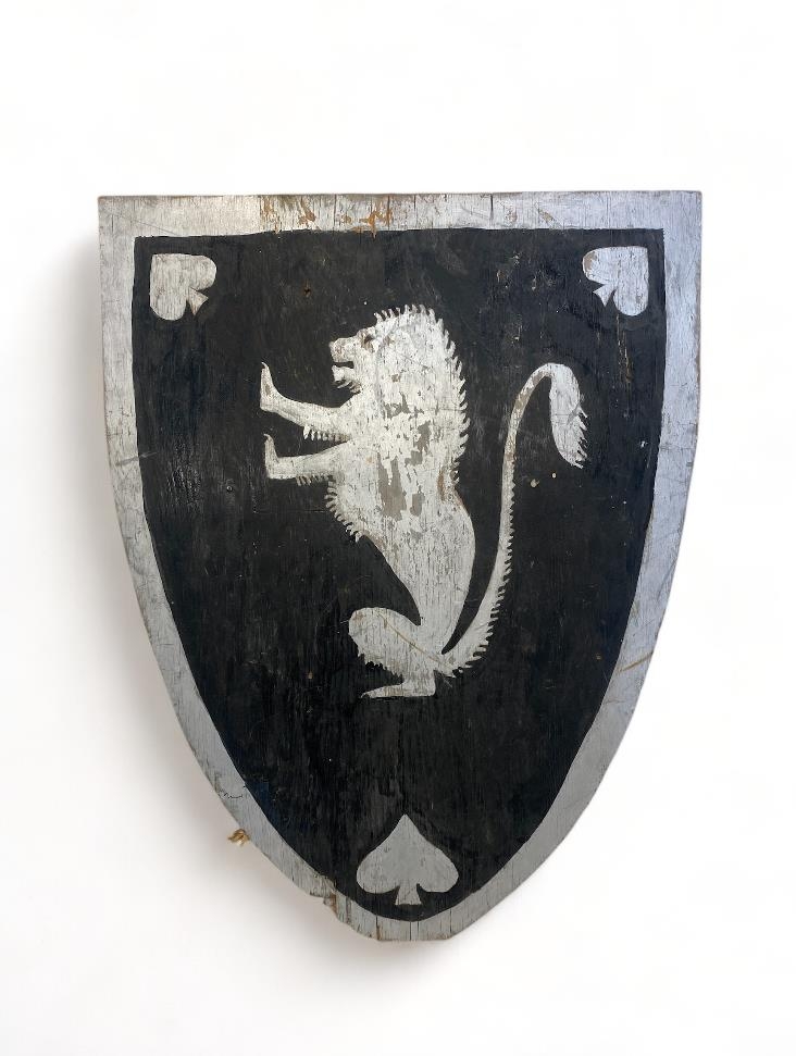 Leikfangaskjöldur úr tré. Á hann er málað ljón og þrír spaðar (hjörtu).