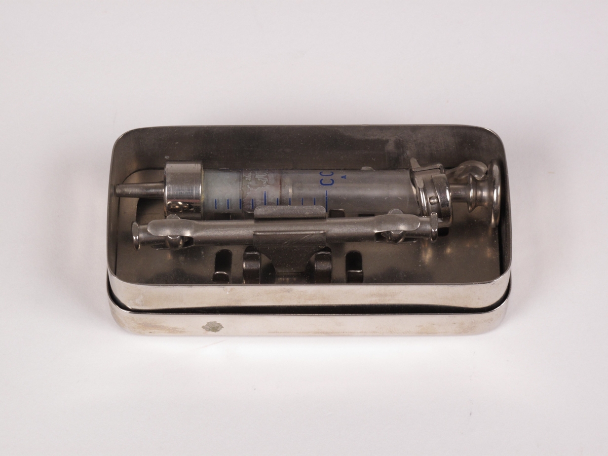 Sprautan er 8 sm löng úr gleri og krómuðu járni. Tvær nálar fylgja. Er í krómuðu járnboxi.