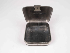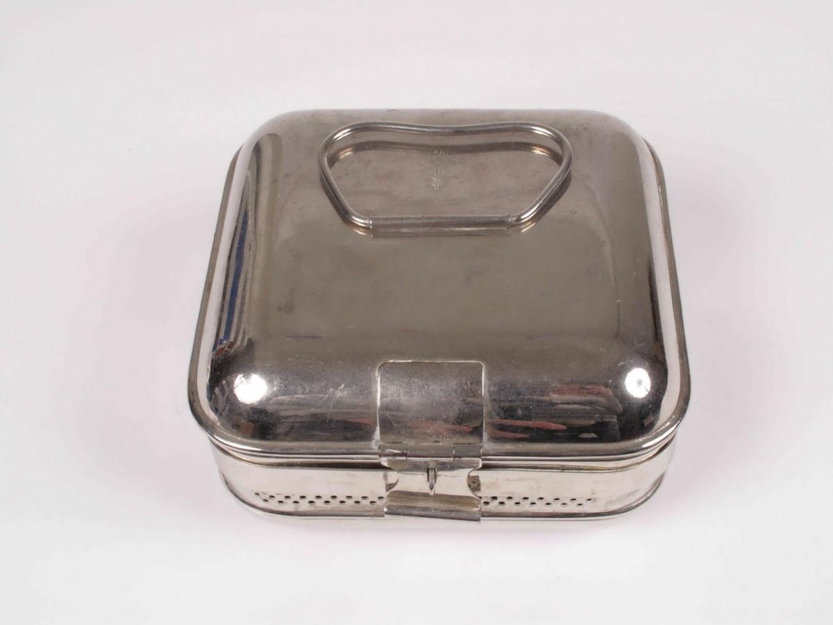 ´Sótthreinsunarbaukur (Autoklav-baukur) Ferhyrndur úr krómuðu járni. 15,5 x 15,5 sm. Hæð 8,5 sm.