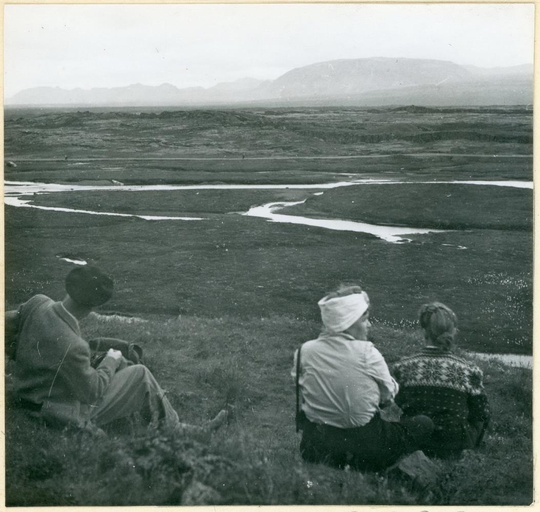 Horft aftan á þrjár manneskjur, einn maður og tvær konur, sem sitja í brekkunni hjá Lögbergi á Þingvöllum. Horft yfir vellina, ána og hraunið. Í fjarska sjást Hrafnabjörg.