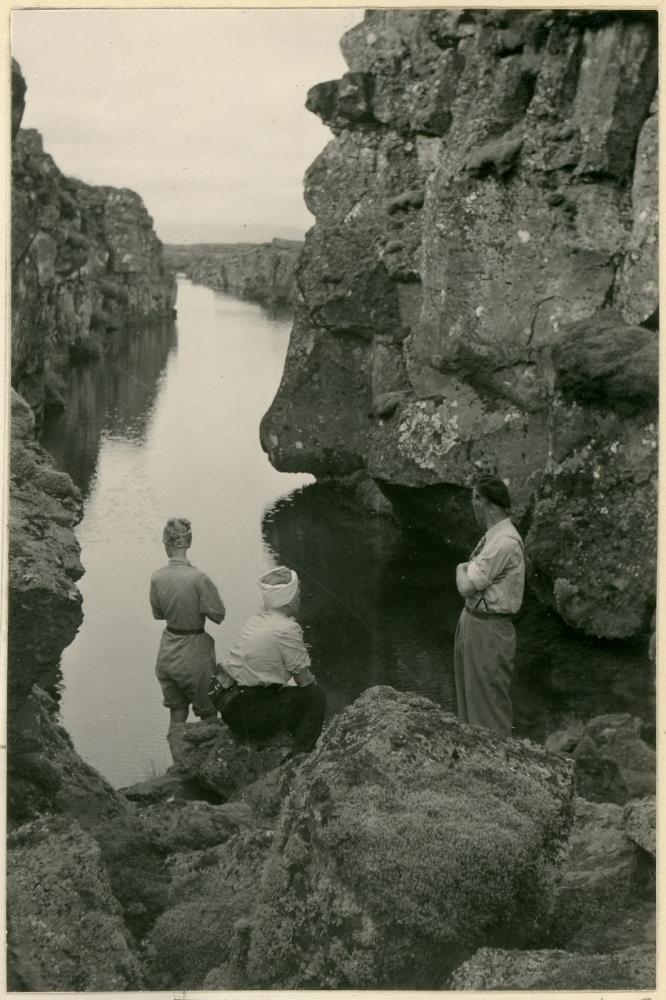 Horft aftan á þrjár manneskjur, tvær konur og karlmann. Þær standa á bakka Flosagjár og horfa eftir henni. Texti með myndinni er: "Flosigjá, som Njalssagans Flose tog ett språng över".