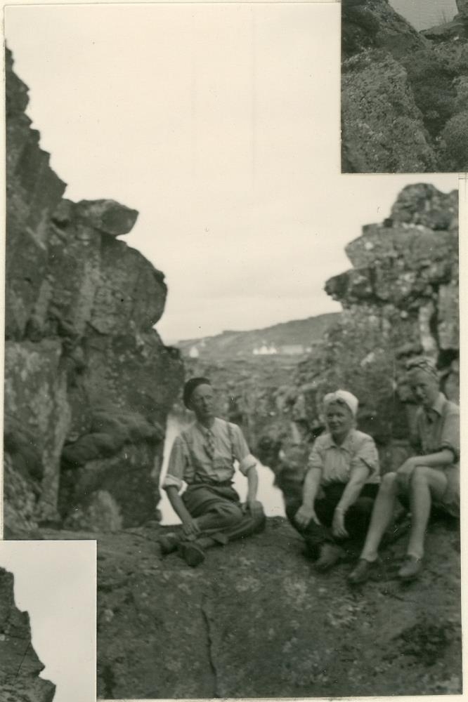 Þrjár manneskjur, einn maður og tvær konur, sitja á bakka Flosagjár. Í fjarska sést í Þingvallakirkju og Vallhöll.