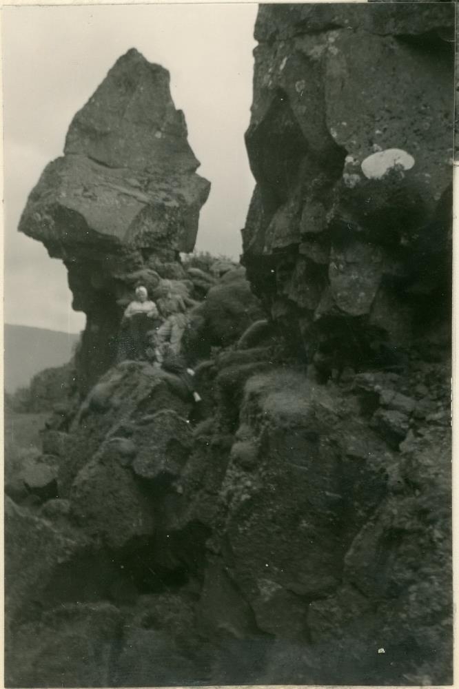 Þrjár konur upp í klettum austan megin í Almannagjá. "I Almannagjá" stendur með myndinni.