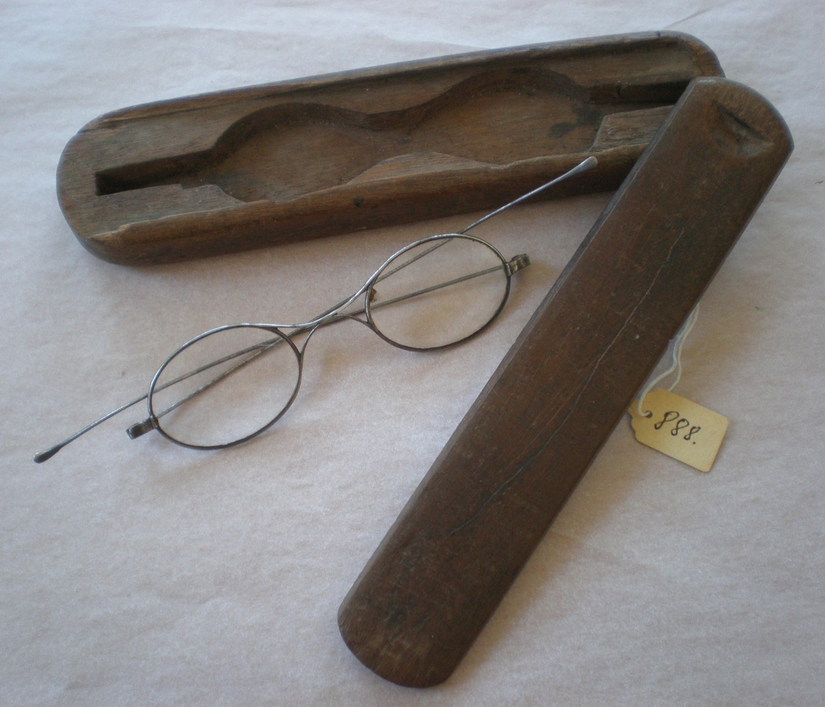 Fínleg hornspangargleraugu í tréhulstri með renniloki, sem Gísli Andrésson á Vogalæk smíðaði, kemur frá Ökrum í Hraunhreppi.